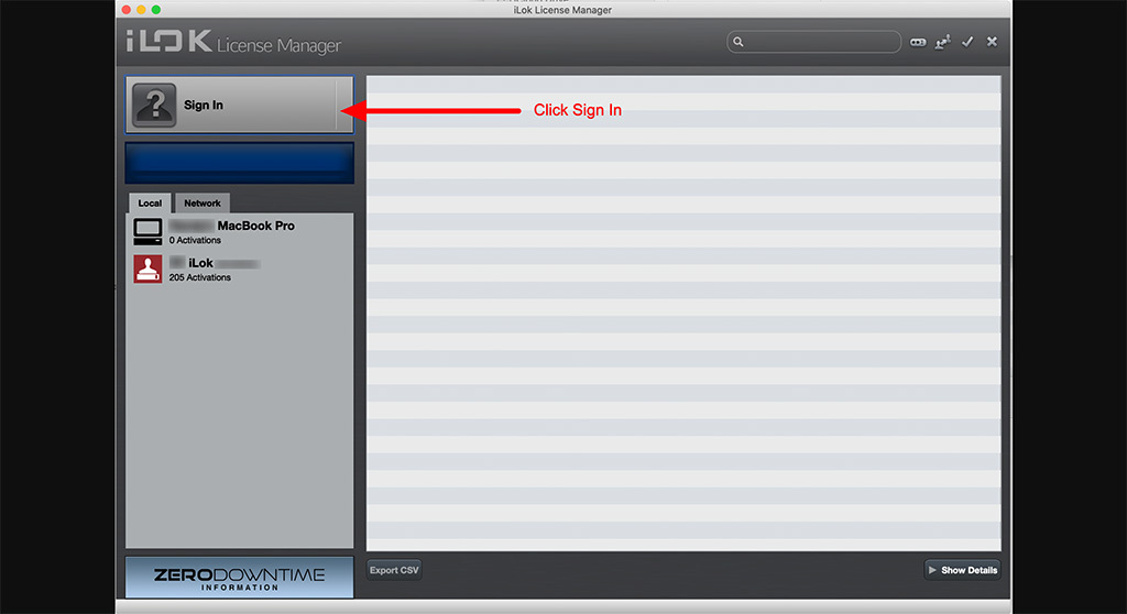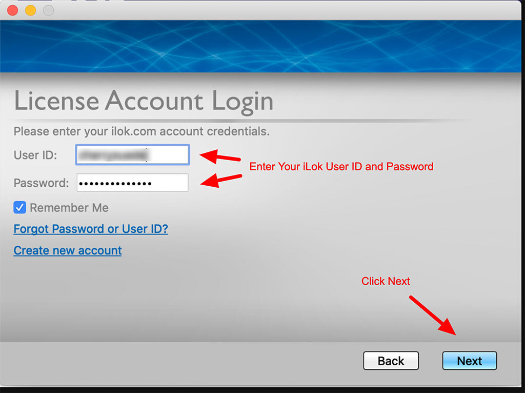 開啟 iLok License Manager 應用程式後,使用您的 iLok 使用者 ID 和密碼登入。