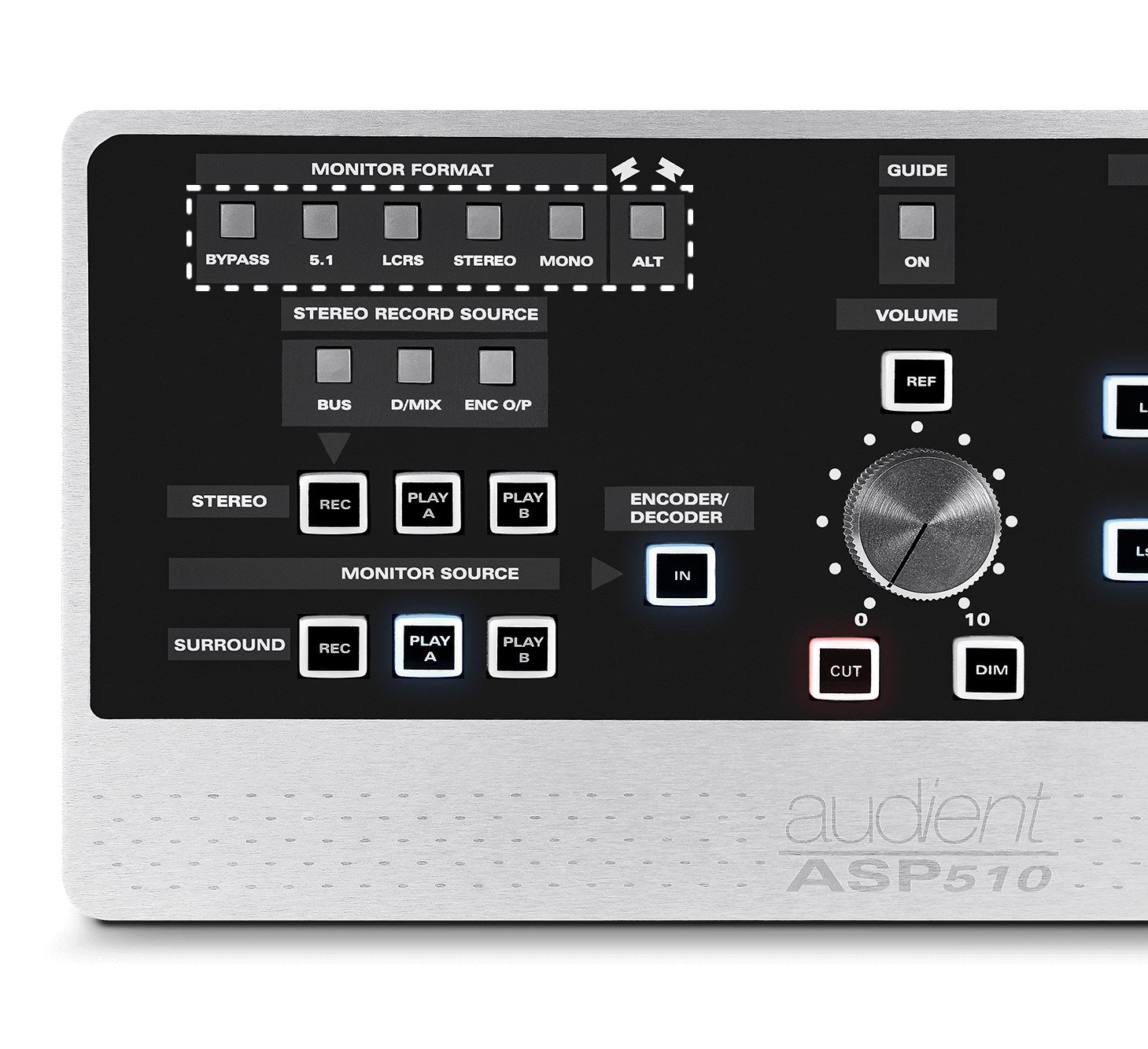 ASP510 還使您能夠在環繞聲或立體聲設置中隔離/剪切單個揚聲器,非常適合準確定位混音元素。您還可以連接控制台或 DAW 的直接立體聲輸出,只需按遙控器上的旁通按鈕即可在立體聲中工作