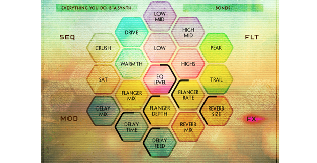 Retcon 的功能頁面分為六大區塊,包括「聲音」、「濾波」、「效果」、「選項」、「調變」與「序列器」,共 19 個六角形控制元件,每頁皆設有易於辨識的色彩標示,操作直覺又快速。