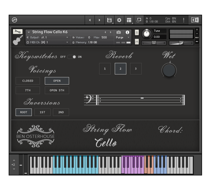 String Flow Cello 取樣自弦樂手一種特殊技巧——快速將弓拉過多條弦來營造出充滿活力、和弦化的質地聲響。這套樂器提供兩種演奏方式: