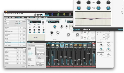 BFD3 內建的混音引擎擁有 DCAM 模型壓縮、濾波及其他效果,並且提供出色的均衡器與算法混響效果。您甚至可以將外部訊號作為壓縮側鏈源來使用。全新的工作流程增強功能讓您可以隱藏多個鼓與環境麥克風,簡化混音操作,並且輕鬆將多個頻道路由至獨立輸出,以便與其他插件或外部設備進行處理。BFD3 還提供了多通道音頻直接導出至磁碟的功能。Groove 也可以通過拖放的方式導出,非常適合編輯循環音效。