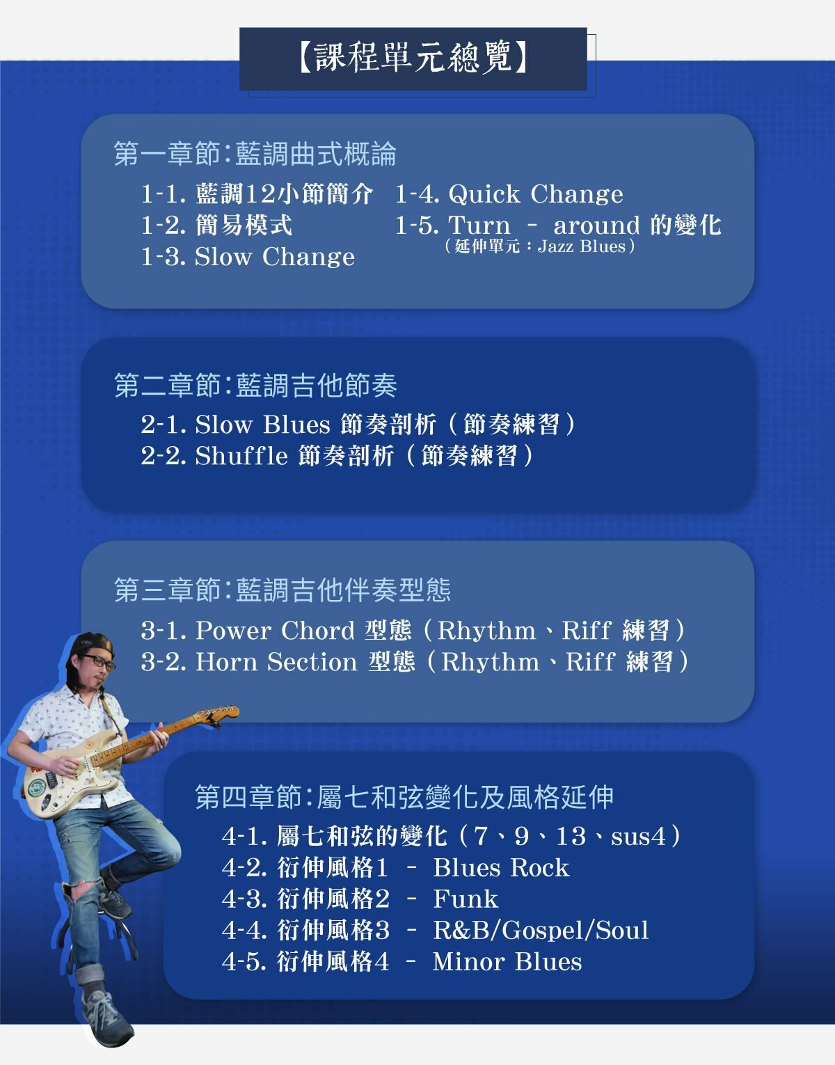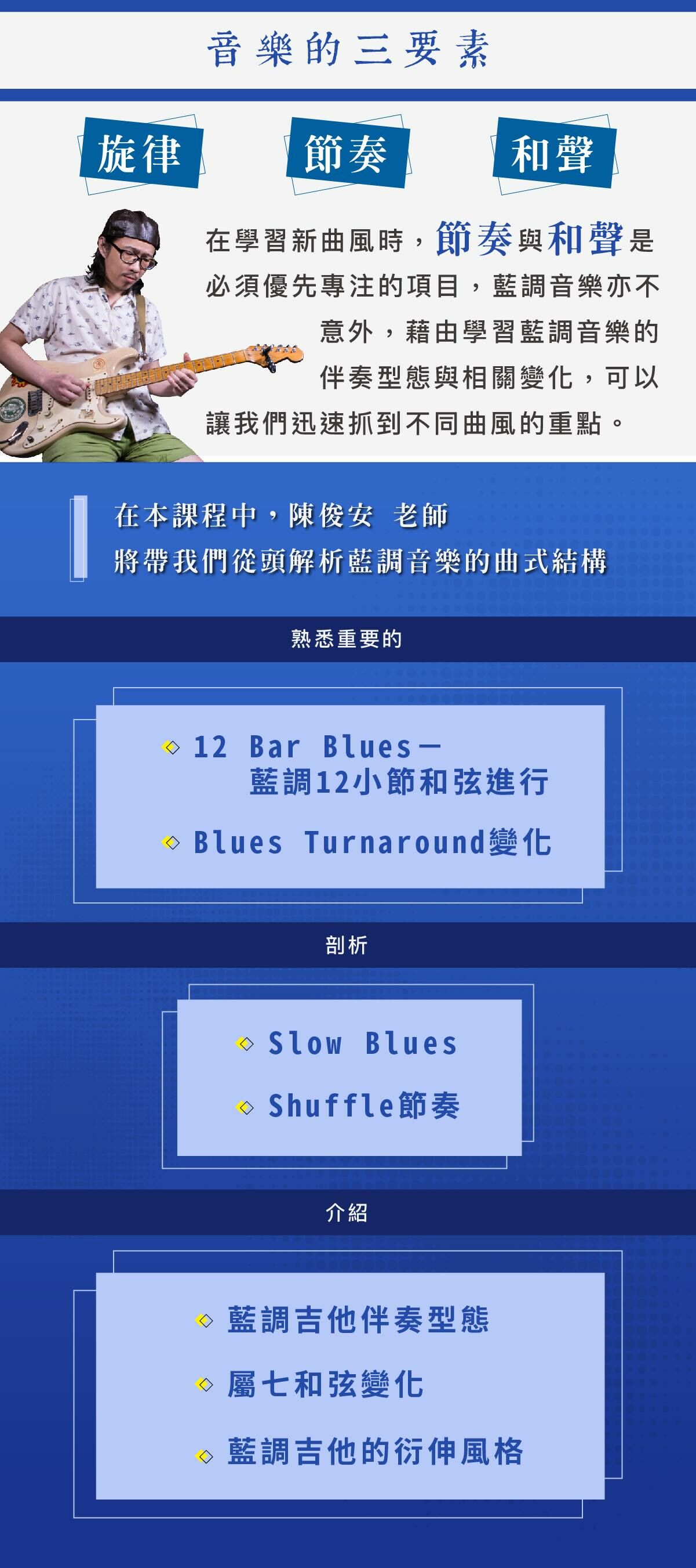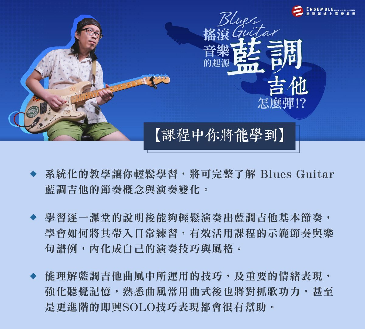 本課程【 搖滾音樂的起源:藍調吉他怎麼彈?!】與講師 — 陳俊安 老師 將帶領學員們熟悉藍調吉他的基本概念,不論你是剛接觸吉他學習的吉他新手,還是已習琴一陣子,有基本演奏概念的吉他手,都歡迎加入線上課程,讓藍調吉他教學經驗豐富的 陳俊安 老師,完整告訴你藍調吉他的入門要點,帶你進入藍調吉他的世界,輕鬆掌握搖滾音樂的靈魂精神!