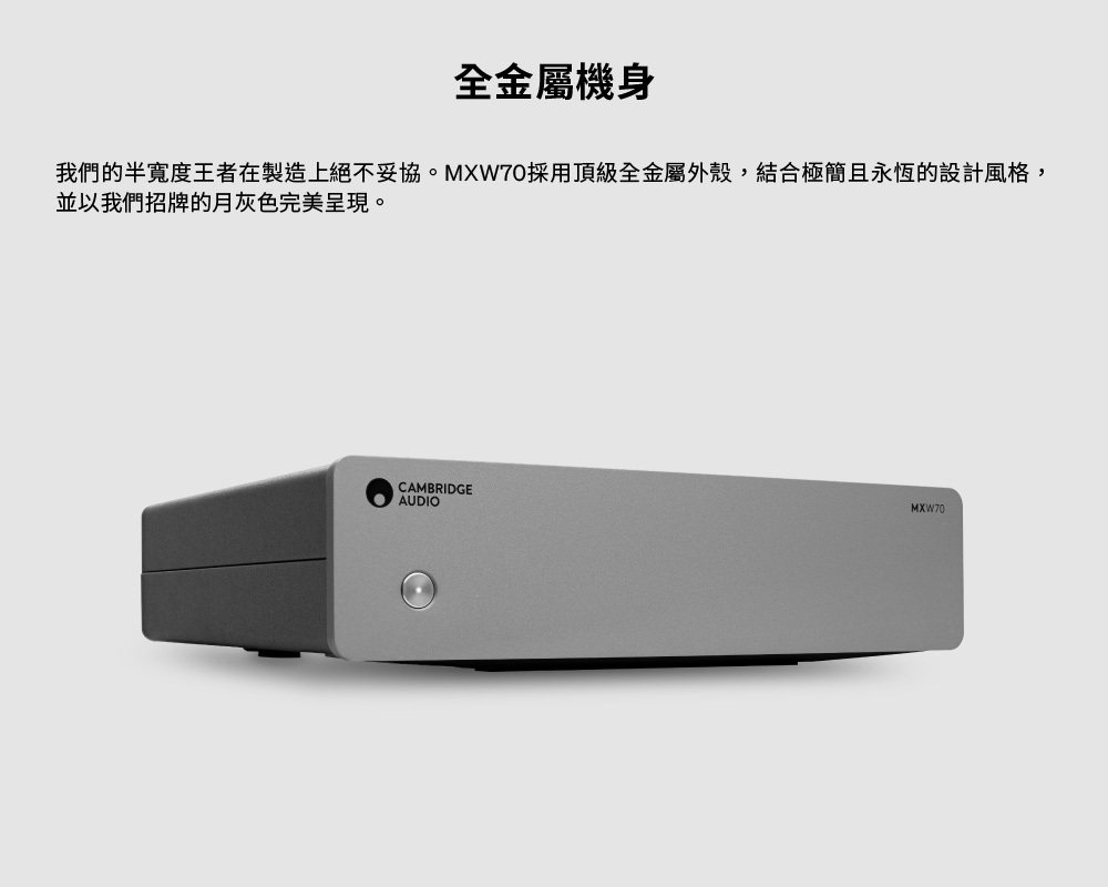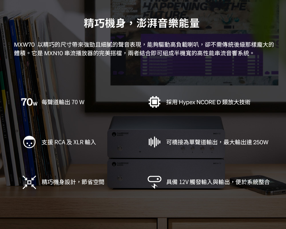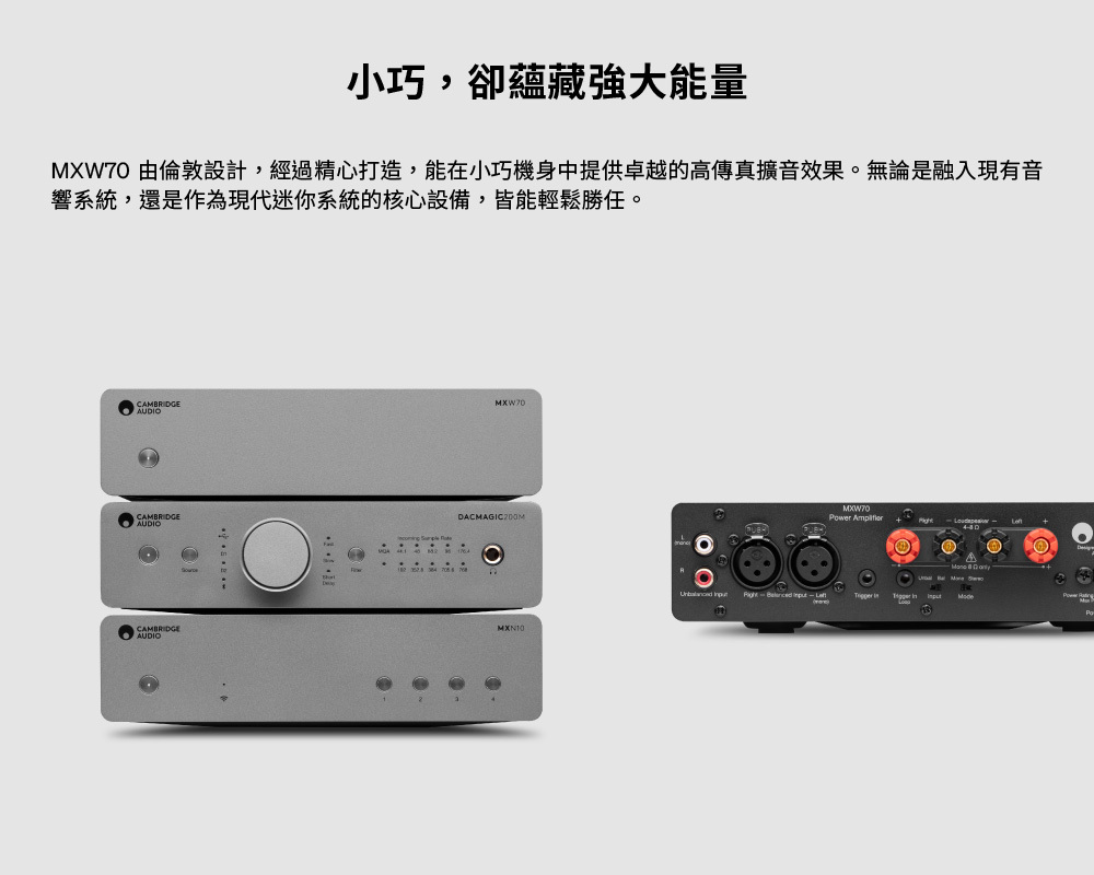 音樂的力量,小巧的體積。MXW70 可為任何設定增添動力和細節,即使驅動難度較高的揚聲器,也不會像其他功率放大器那樣笨重。它是我們 MXN10 音樂串流伺服器的完美搭配,可組成一個半寬的高效能串流系統。