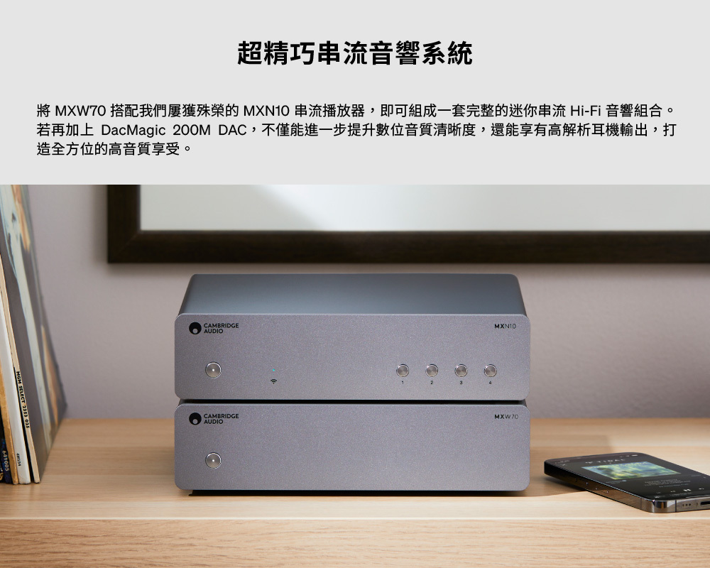 將 MXW70 與我們屢獲殊榮的 MXN10 音樂串流伺服器結合,即可組成完整的精巧串流高保真音響組合。再加上 DacMagic 200M DAC,便可獲得更高的數位清晰度和高解析耳機輸出。