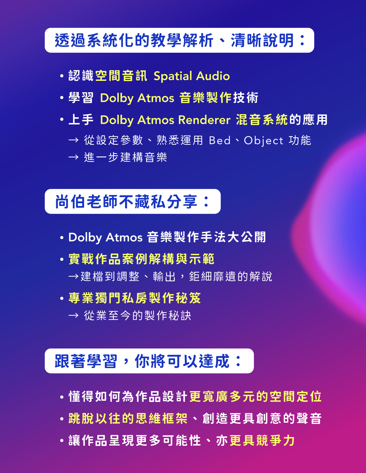 【揚聲堡音樂線上課程】破解杜比全景聲音樂製作 Dolby Atmos Music Creation - 林尚伯 老師