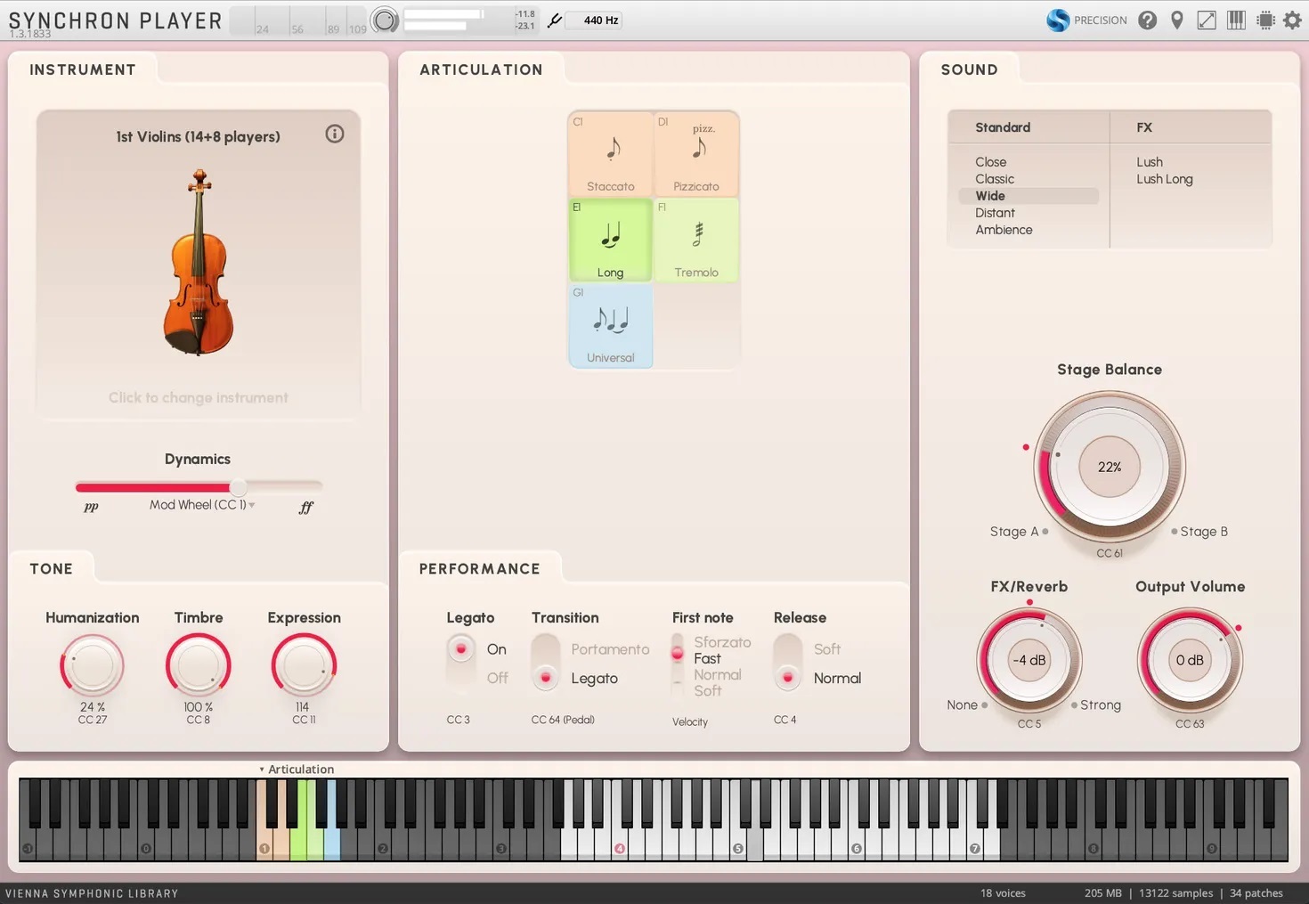 Flow View 介面設計直覺,將所有關鍵控制項集中於手指可及之處,讓您完全沉浸在創作流程中。演奏速度與力度將自動切換演奏法,搭配簡便的音色調整功能,讓您專注在音樂本身:
