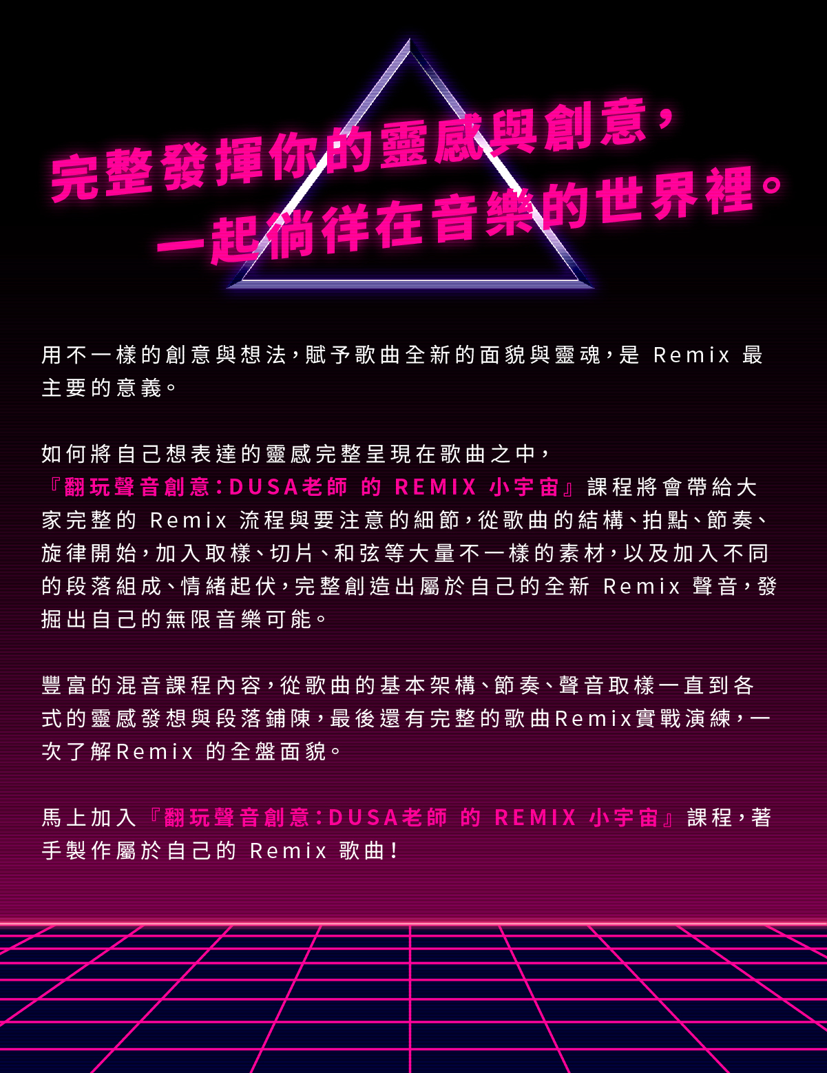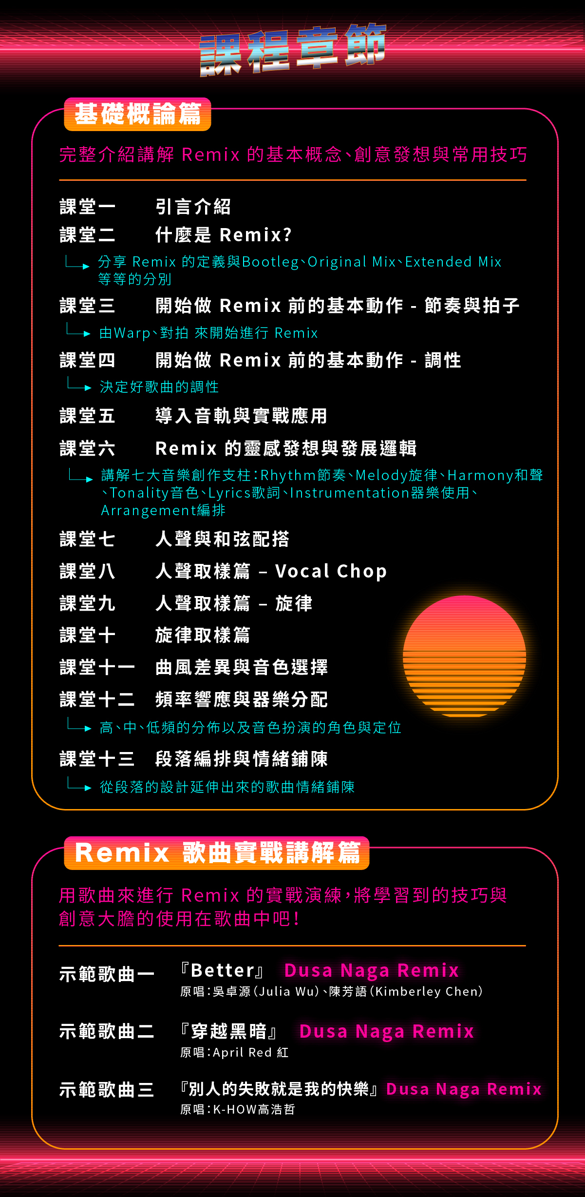 無需任何音樂背景知識,只要對 Remix 混音應用、數位編曲音樂製作等有興趣的朋友,都可以從這堂課開始學習唷!