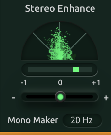 利用Stereo Enhance 和Mono Maker 控制來控制音軌的立體聲影像。 Stereo Enhance 控制可以擴大或縮小立體聲寬度,而Mono Maker 則透過將立體聲影像縮小到定義頻率以下來聚焦低頻。