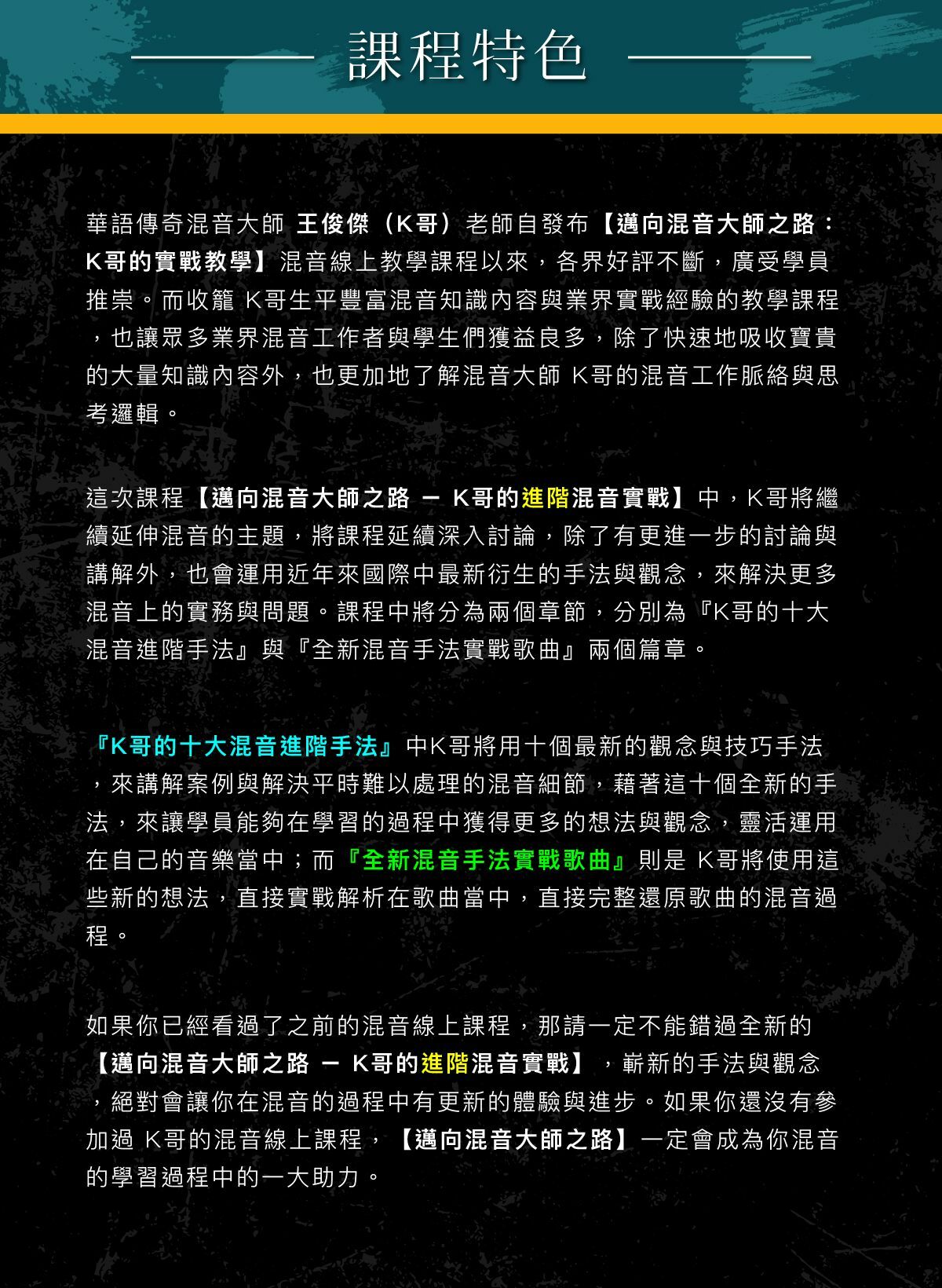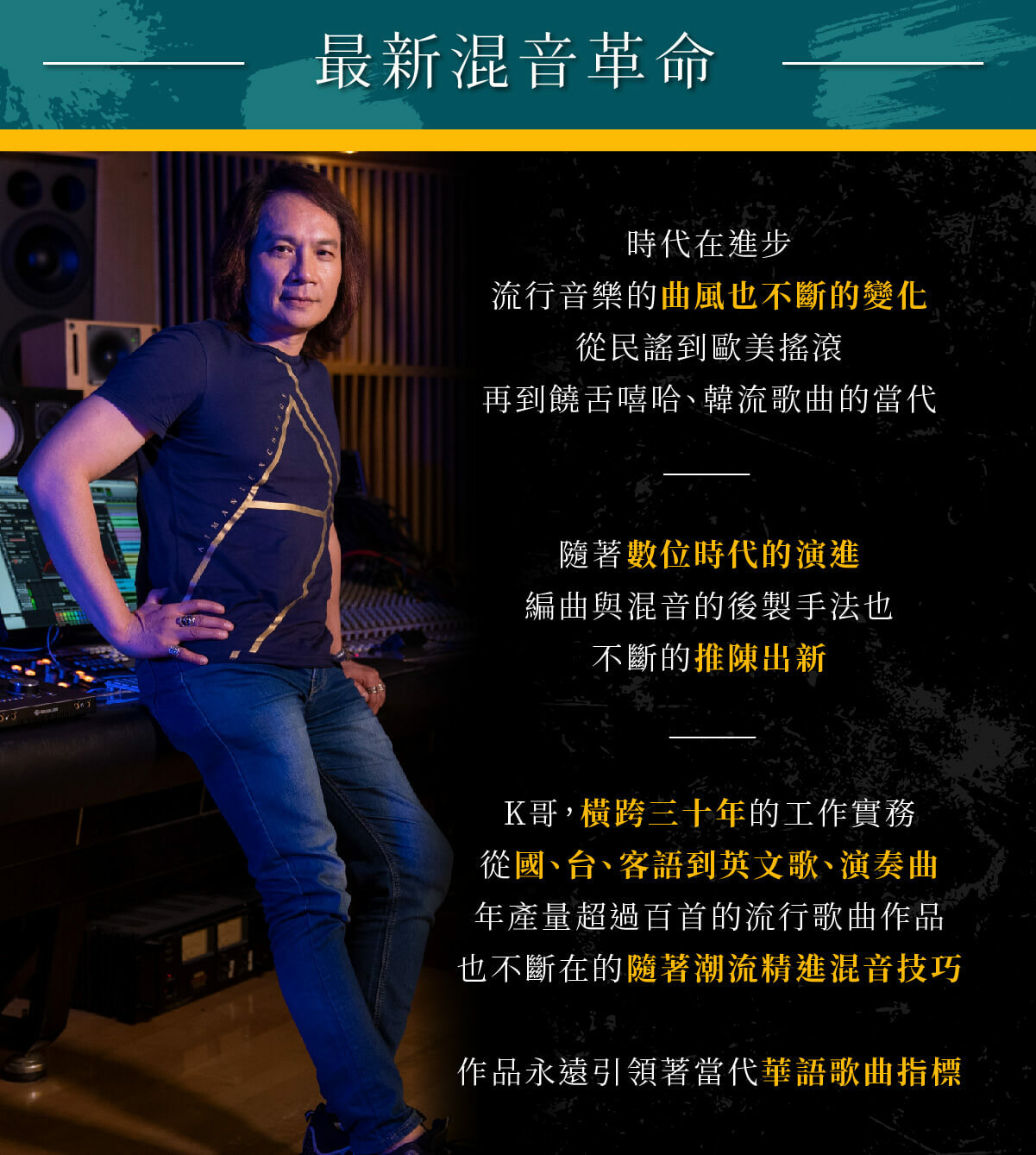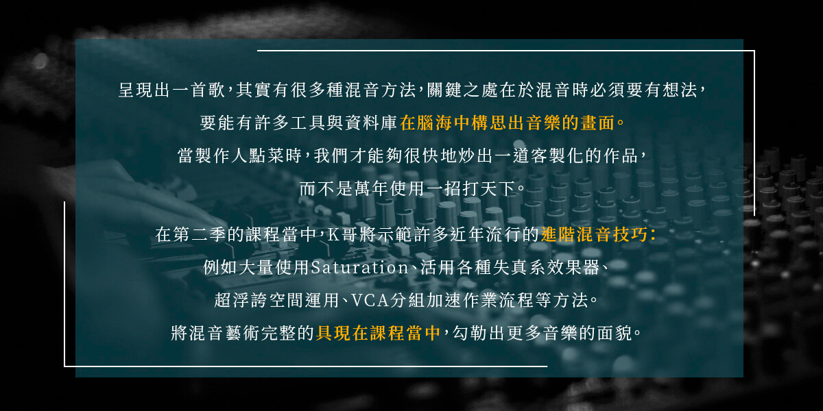 ※第一季課程迴響熱烈、好評不斷!歷經一年多籌備醞釀,K哥將在第二季進階課程中帶來全新混音手法!