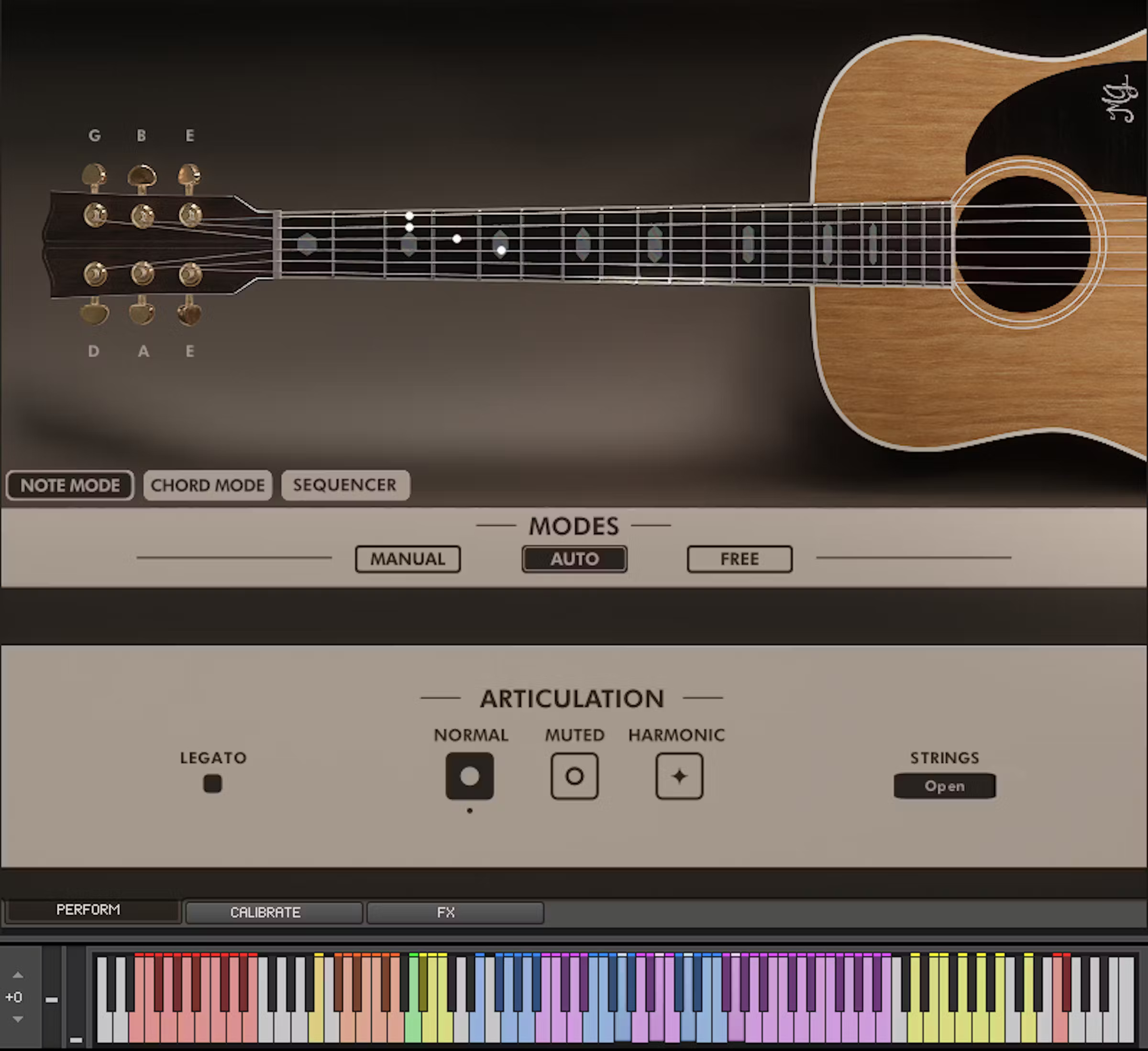 MG Soft Acoustic Guitar 透過一對經典 Neumann U87 麥克風,在 Spitfire HQ 錄製,忠實還原 Martin J-40 鋼弦吉他的溫暖音色。此音色庫具備多種彈奏模式,包括功能豐富的和弦/掃弦系統、完全可自訂的步進音序器,以及 MIDI 拖放功能。深度採樣涵蓋吉他的所有常見演奏法,如悶音、泛音、滑音、連音、顫音,以及弦與琴身的敲擊聲,讓您的作品充滿真實感與動態表現力。