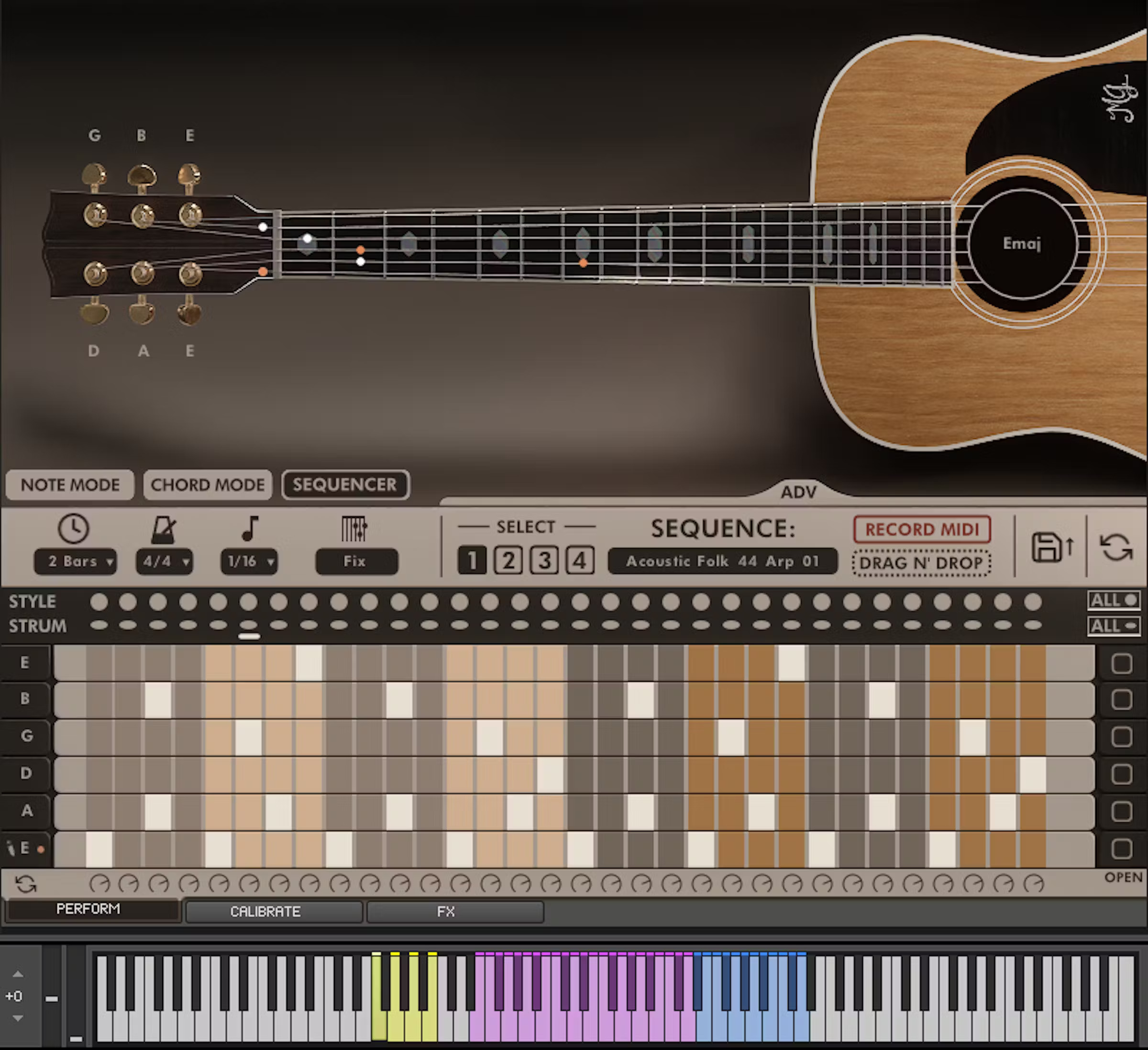 內建 4 組音序庫,最多支援 32 步的完全自訂音序器,可載入、編輯並儲存預設音序。每個音序步驟皆可設定撥奏弦數、演奏法、撥弦方向與音量,並能錄製 MIDI 資訊,直接拖放至 DAW,極大提升編曲效率。