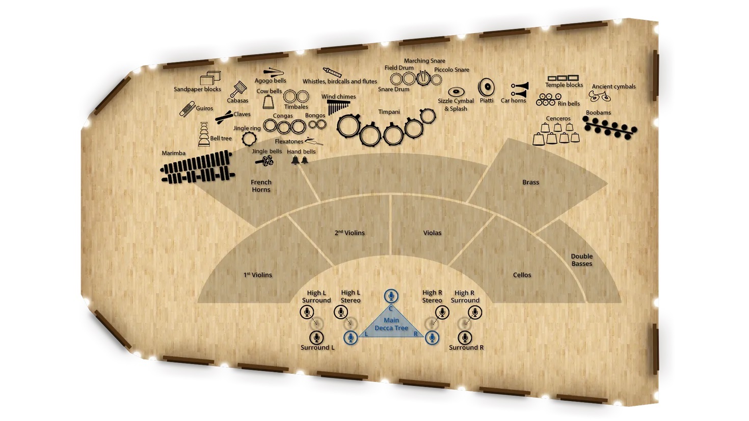 包括康加鼓、邦哥鼓、馬林巴、鈴鐺,甚至是「大型定音鼓」合奏等多種精緻樂器,皆於我們寬敞的 A 廳錄製完成。這是一個集世界級聲學設計、尖端科技與專業錄音技術於一身的空間,是打造極致打擊樂音色的理想場所。
