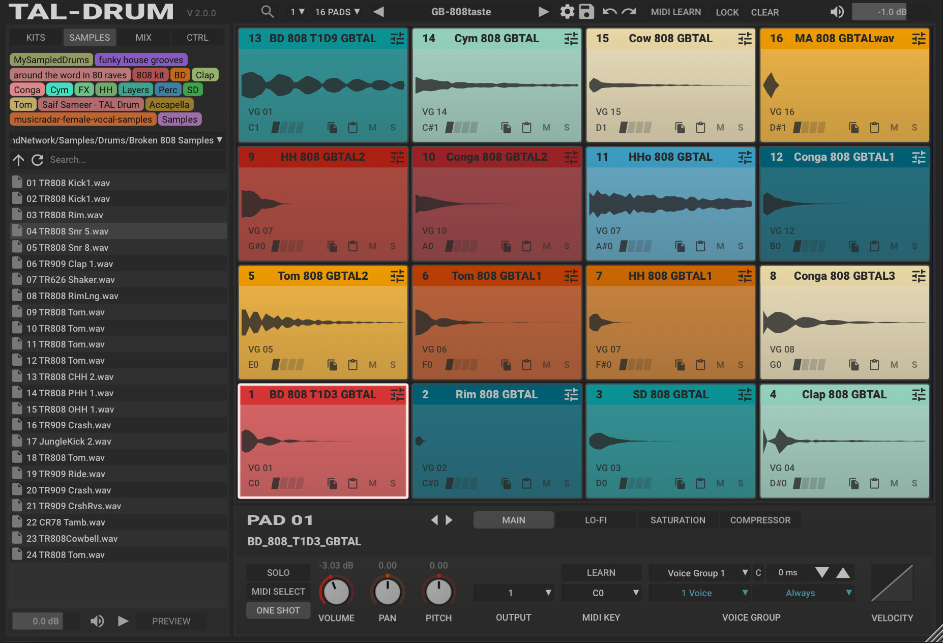 • 16 組立體聲輸出:TAL-Drum 僅內建少量效果器,鼓勵使用者在 DAW 中使用自己喜愛的 EQ 和混音效果。