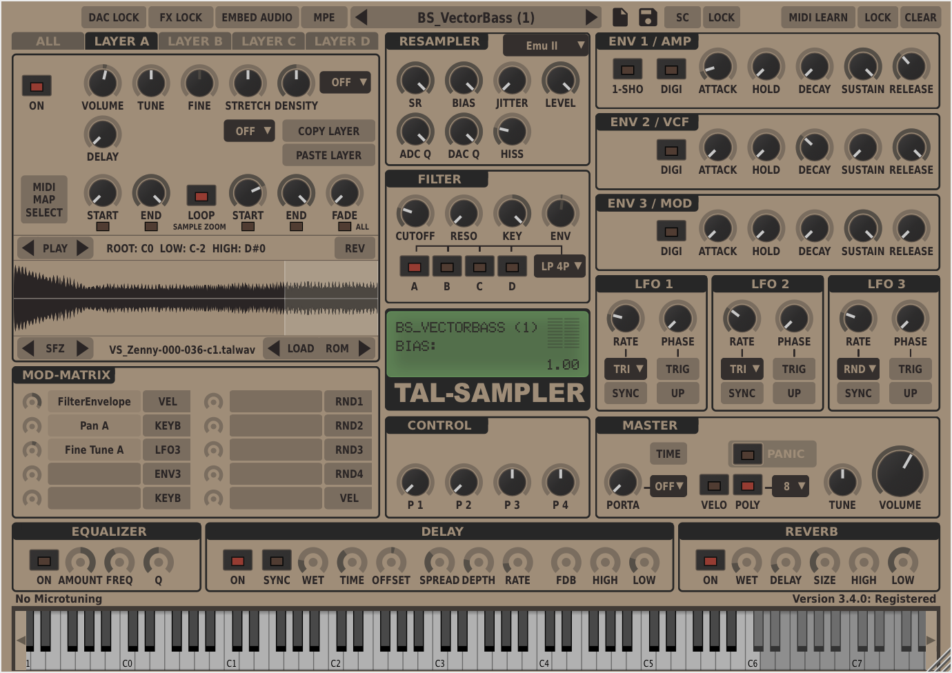 TAL-Sampler 不僅僅是個取樣播放器,它是一款具備完整類比建模功能的合成器,並以取樣引擎作為聲音來源。內建高品質的自震濾波器與強大的調變矩陣,提供極高的聲音塑形自由度。