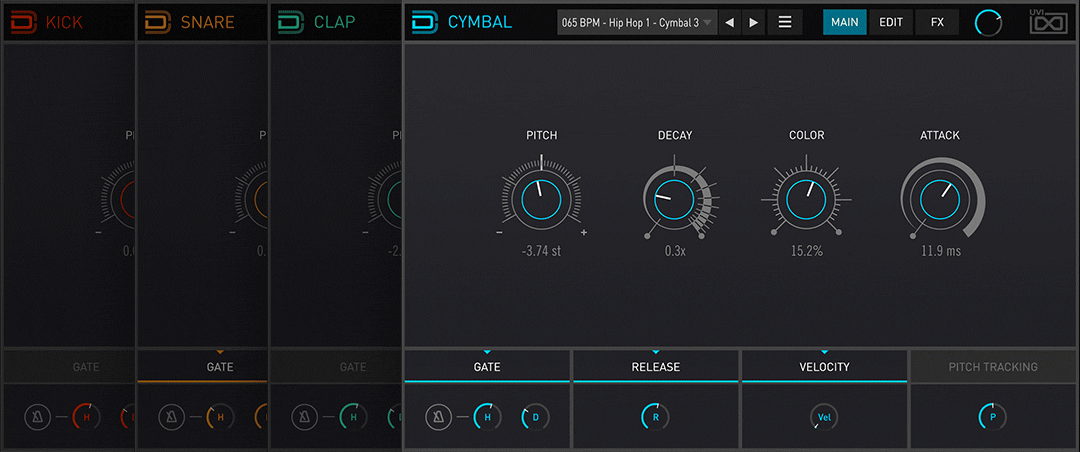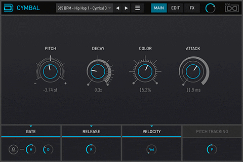 2 個複雜的噪聲和金屬紋理層,在每次觸發時創建輕微而自然的變化。起始相位還可以鎖定,以獲得更傳統的樣本行為。鈸鼓的打擊形狀可以輕松定制,允許創建各種各樣的聲音:封閉式高音鼓、敞開式高音鼓、沖擊、騎行、沙克、手鼓、敲擊樂器... 還有反向鈸鼓聲、帶有鈸鼓紋理的長時間特效、凍結般的聲音。