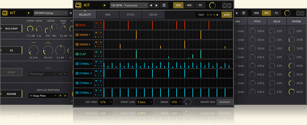 Drum Designer 1.5 的 'Sequencer' 是一個獨立的強大樂器,為您提供了 8 個引擎(1x Kick、2x Snare、1x Clap、4x Cymbal),帶有音量、聲像和音高序列器,最長可達 8 條小節,分辨率高達 1/64t。快速控制每個引擎的時間、增益、聲像、音高以及發送,並使用匯總效果,包括壓縮機、均衡器、延遲和混響,最終完成聲音。甚至可以單擊拖動序列,將其作為 MIDI 複製到桌面或 DAW。