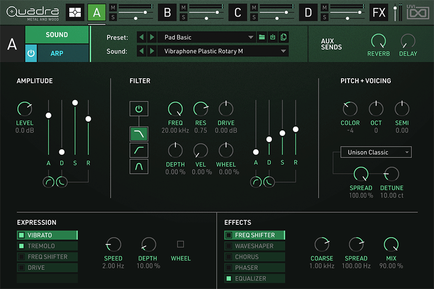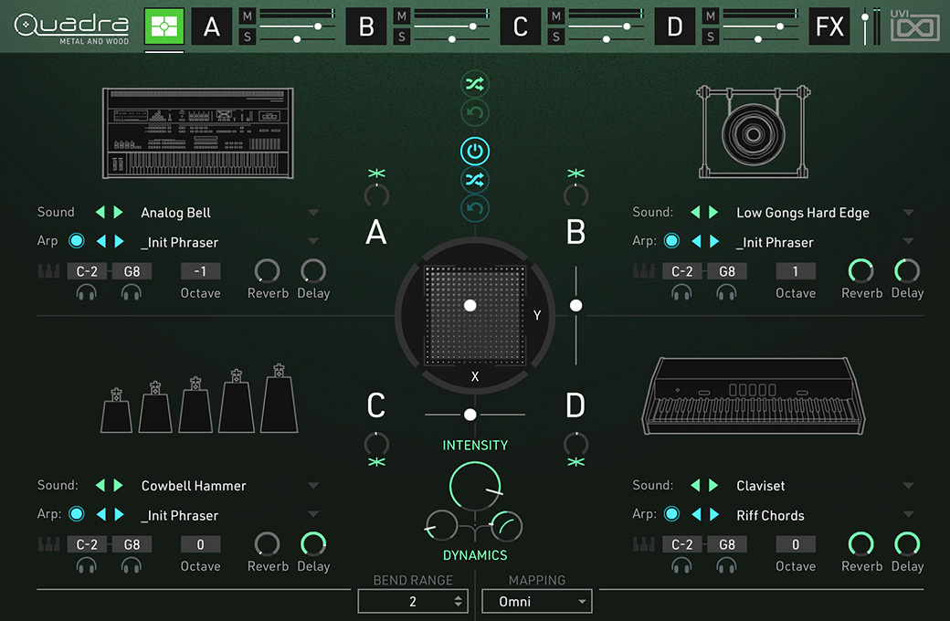 Quadra 是一個強大的 4 部分多合一樂器和序列設計器,它不僅提供了深度取樣的木頭和金屬樂器的聲音,還具備一個強大的四層可變樂器,先進的琶音生成器,MIDI效果等功能。而且還有一個充滿藝術和動態的預設庫,為您的音樂創作提供即時的靈感。