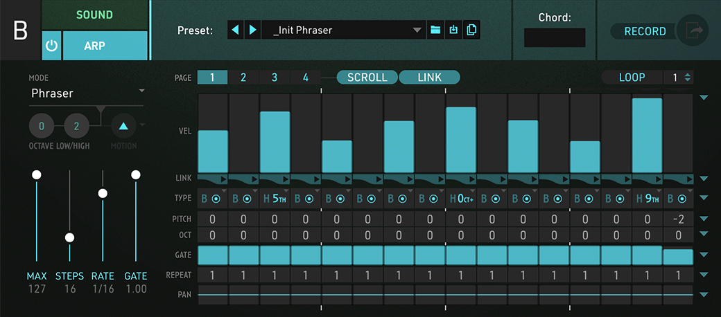 Quadra的每個樂器層的核心是一個強大的多模式64步序列器,帶有MIDI效果,允許您快速添加節奏、創建琶音序列、添加和聲,甚至可以將傳入音符量化到特定的音階。選擇全局速率、脈衝長度和最大速度,然後使用每步速度、連接、和聲、音高偏移、八度偏移、脈衝、步重複和平移自定義您的序列。將您的模式保存到磁盤上以進行共享,或使用便捷的 “複製到” 按鈕將已完成的序列從一個層複製到另一個層。
