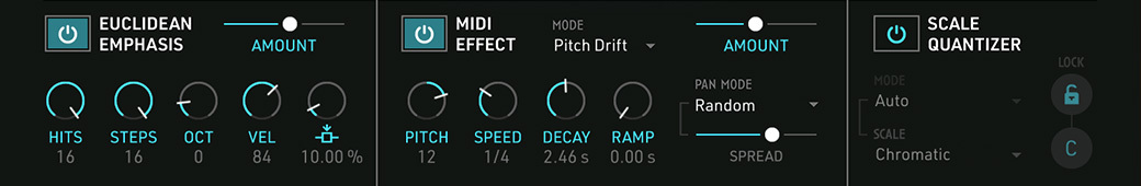 Quadra 包括多個 MIDI 效果模塊,允許您以創意的方式裝飾和增強序列,包括添加節奏重點的歐幾里德強調、MIDI 延遲、隨機和音高漂移,以及一個音階量化器,允許您將所有音符捆綁到您選擇的音階上。您甚至可以將修改後的序列拖放為 MIDI 到您的 DAW 軌道。