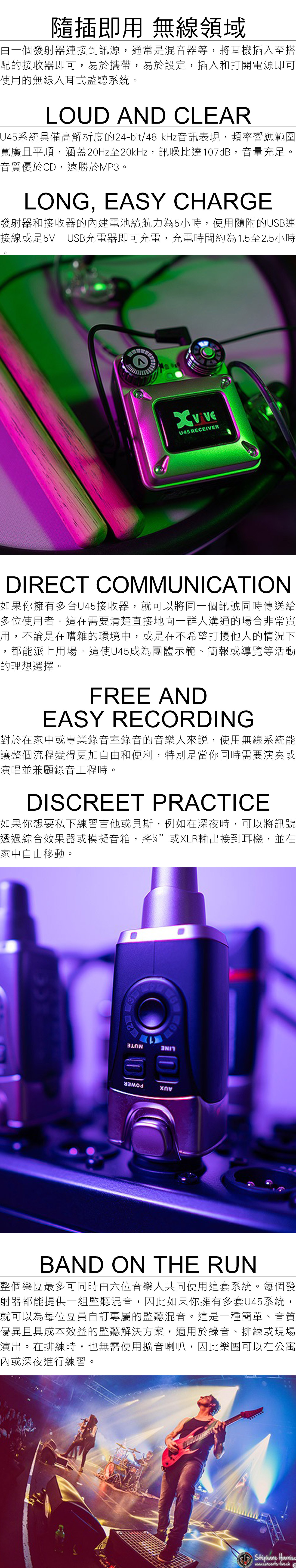 ● 最多可同時使用 6 組 U45 系統,團隊成員可各自擁有專屬耳機監聽