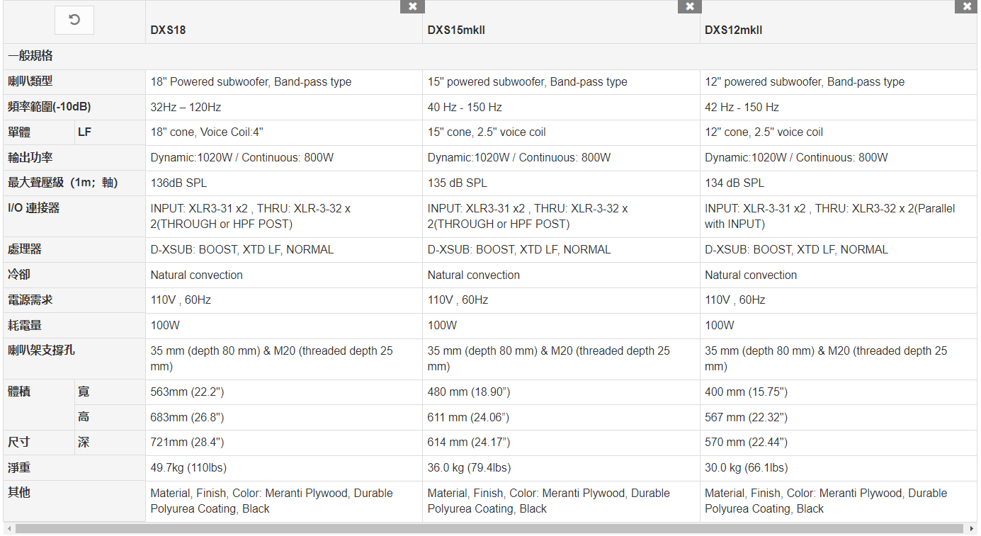DXS18 的高輸出低音喇叭採用 4 英吋音圈磁鐵,可提供功能強大,明確的低頻低音,失真最小。DXS12mkII 和 DXS15mkII 均採用 2.5 英吋音圈磁鐵。