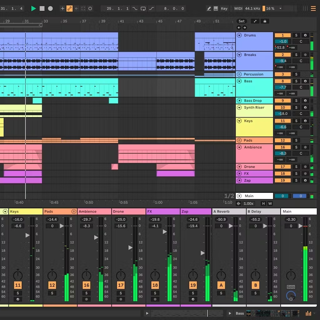 • 保持專注:在排列視圖中使用 Live 的混音器,以獲得更多信息和控制,而無需切換到會話視圖。