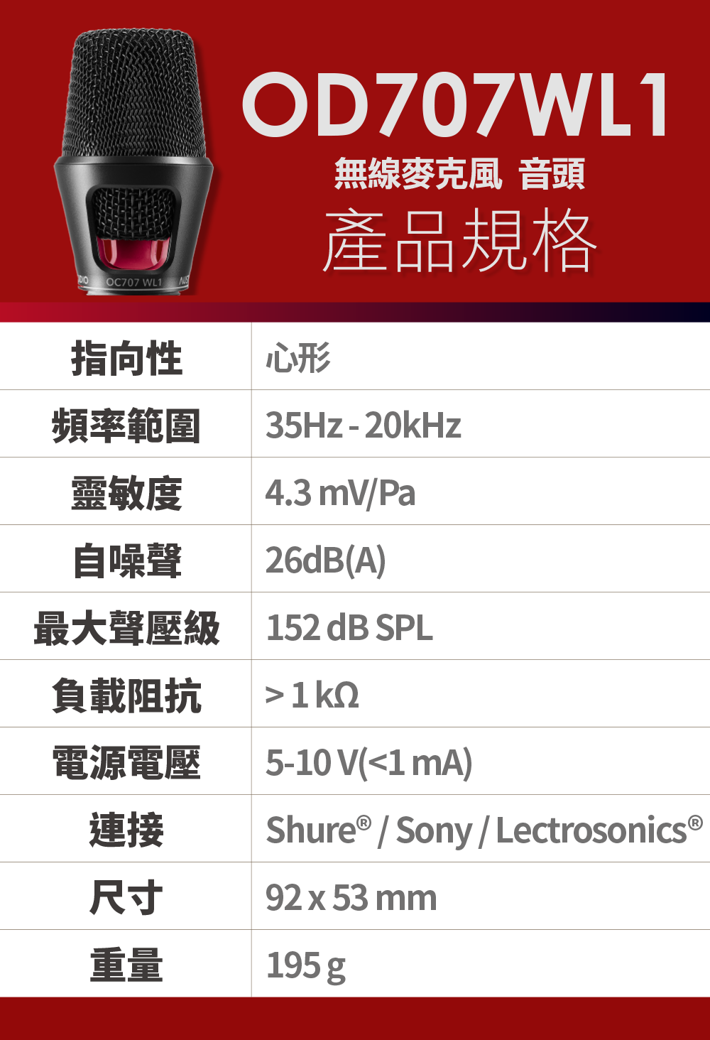 ※僅可使用在Shure無線系統的麥克風音頭