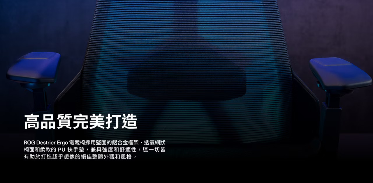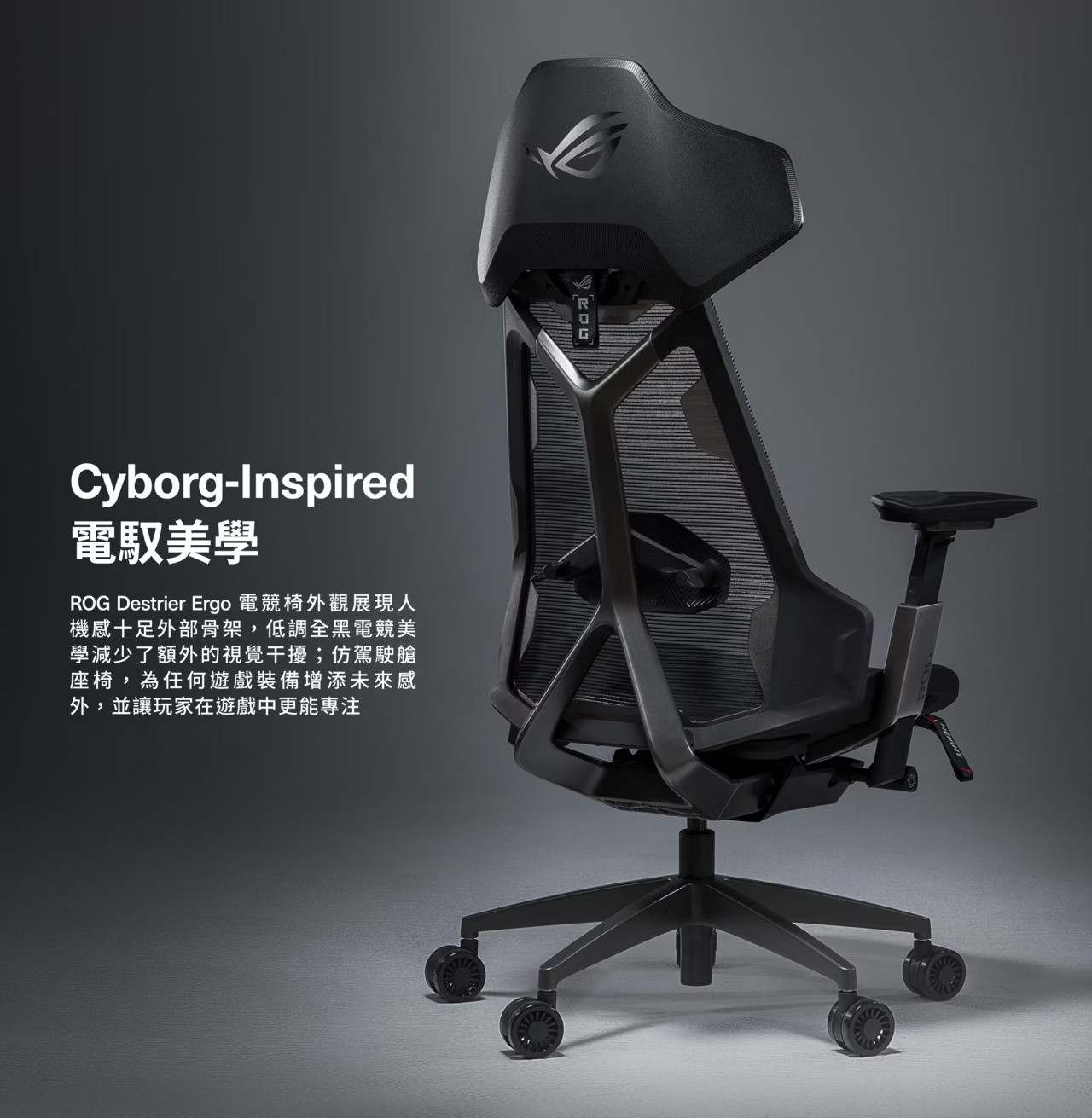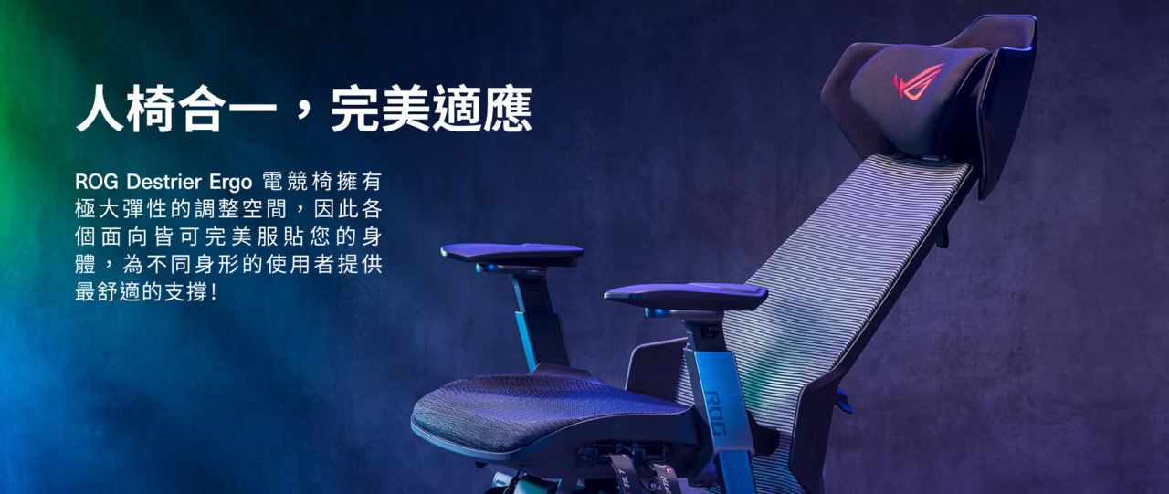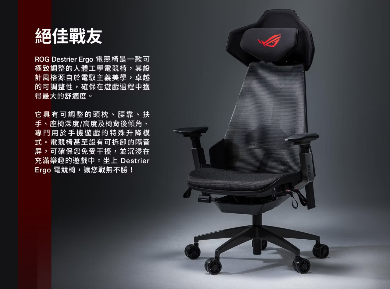 ROG Destrier Ergo電競椅是一款具電馭風格、未來感十足並可極致調整的人體工學電競椅,配有多功能座椅調節提供完美坐姿,特殊手遊模式扶手設計、及可拆式隔音屏可避免外部干擾並提供身歷其境的遊戲體驗