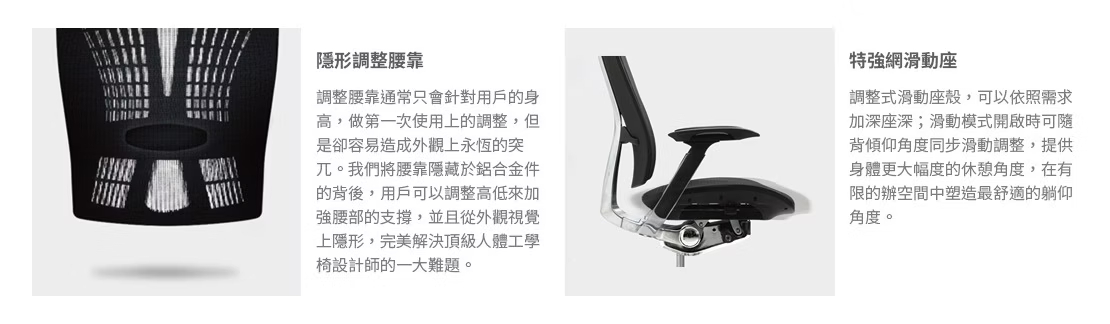 •特強網滑動座,依照需求加深座深,隨傾仰角度同步調整,塑造最舒適