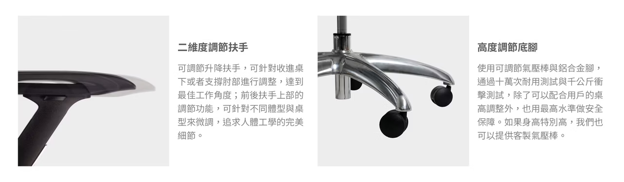 •三維度調整扶手,針對桌型微調高度,追求人體工學細節