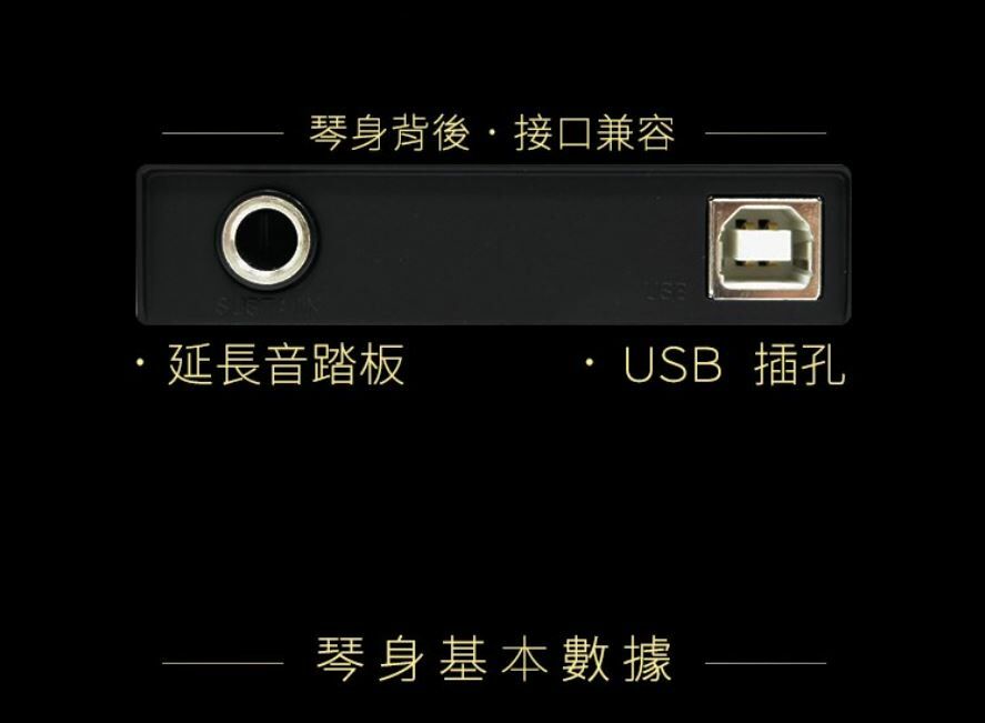 - 連接介面:延音踏板輸入與USB電腦連接口