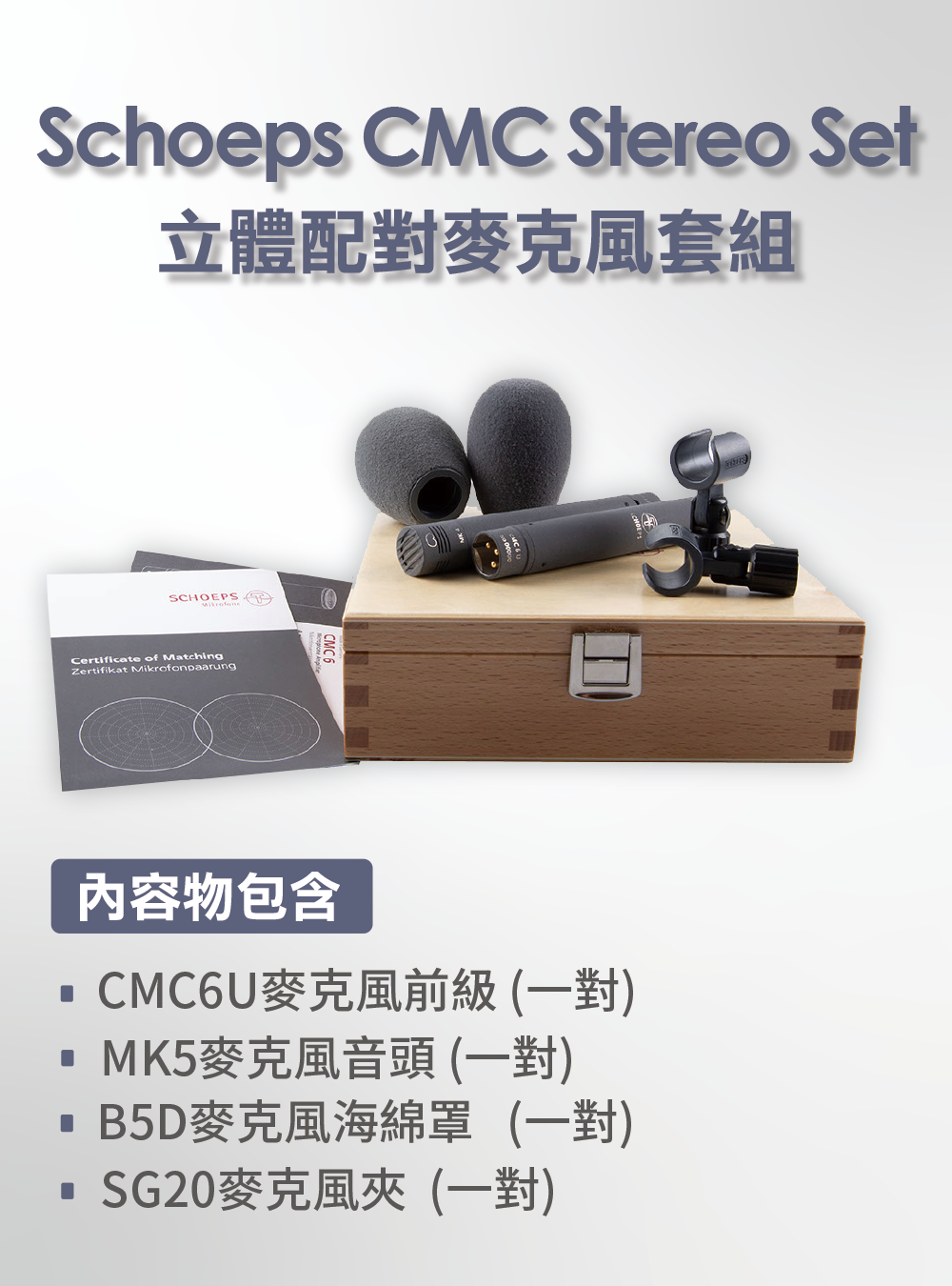 Schoeps Colette 配對麥克風模組採用音頭與前級放大器模組分離式設計,CMC6U前級放大器提供平坦自然的響應,並具有出色的抗射頻干擾能力,可以依據使用需求與同系列各種MK音頭結合使用。連接方式可以直接套上旋轉安裝(音頭與前級放大器均車有螺牙),或藉由連接線連接使用。