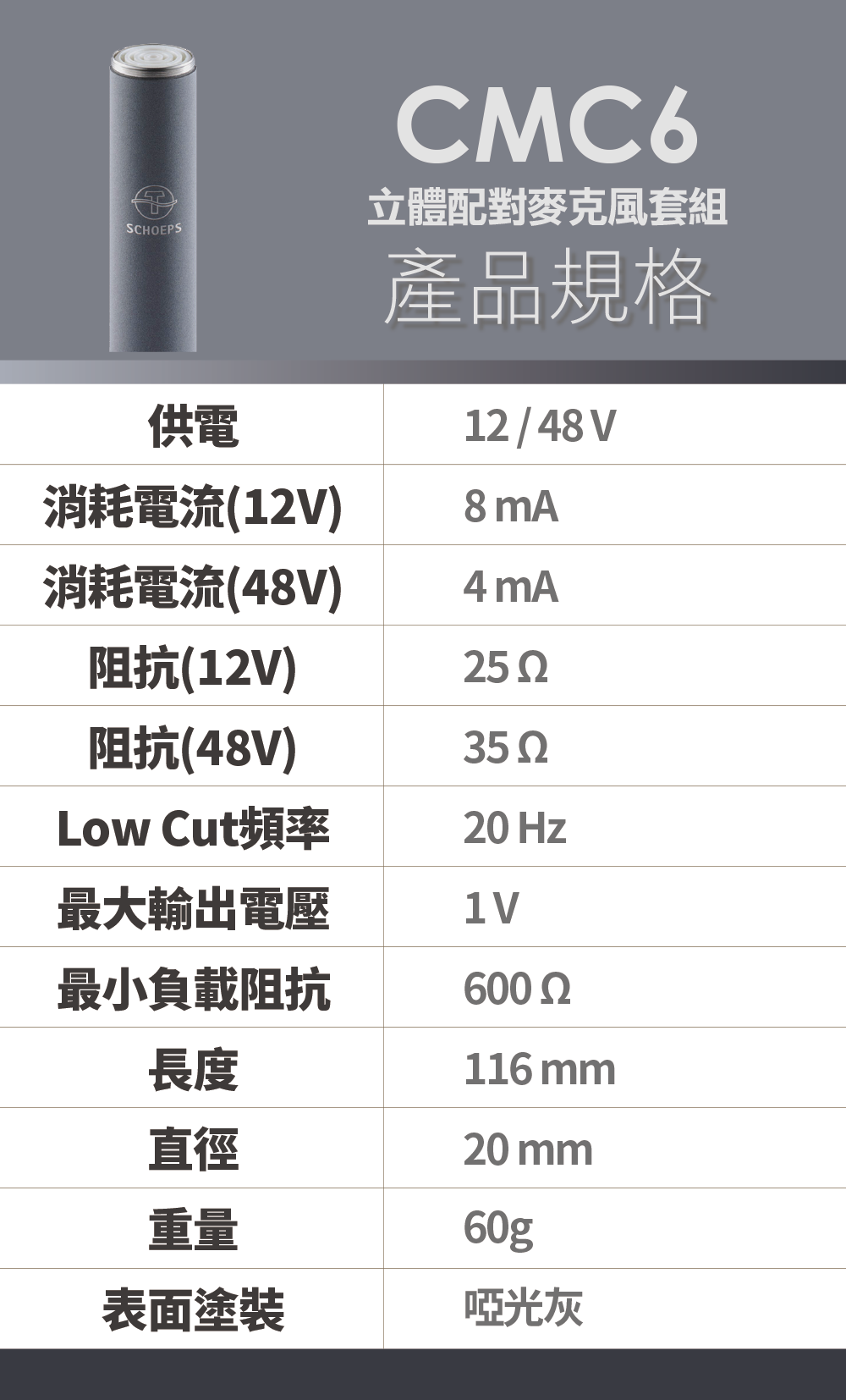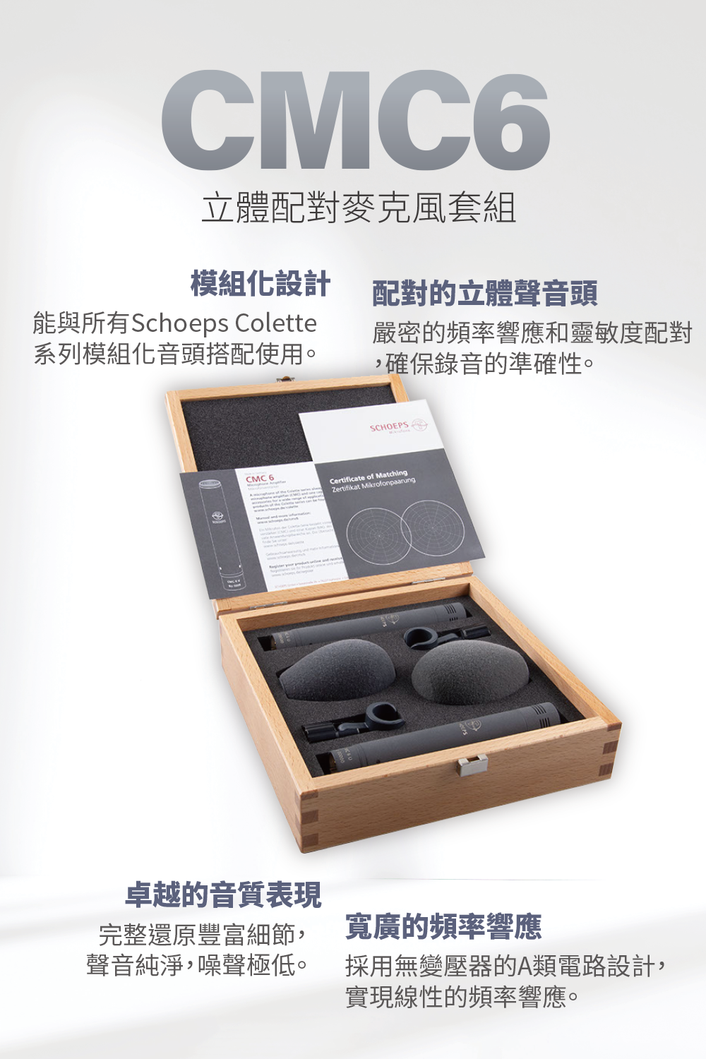 CMC 6是一個精巧的麥克風前級,與Schoeps MK系列音頭結合使用時,CMC 6可提供平坦自然的響應,並具有出色的抗射頻干擾能力。