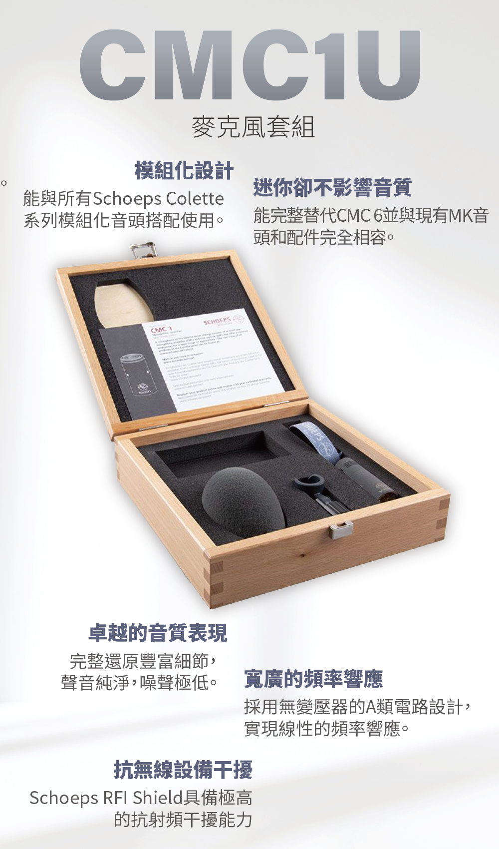 套組包括一組CMC 1麥克風前級+MK音頭,防風海綿,麥克風夾和高級木盒。