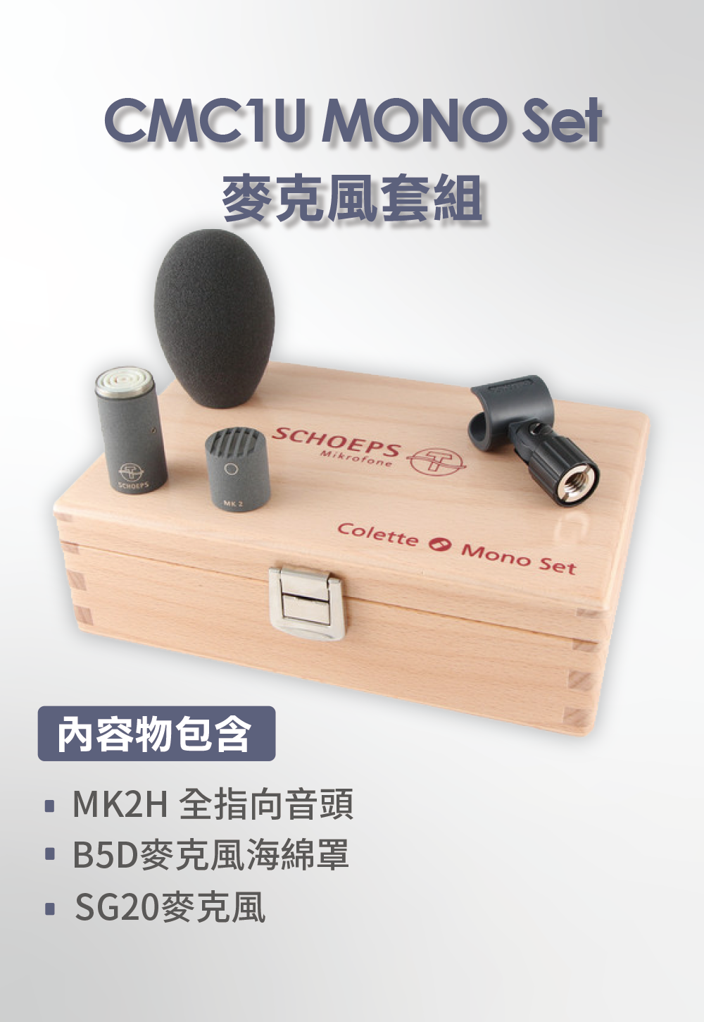 套組包括一組CMC 1麥克風前級+MK音頭,防風海綿,麥克風夾和高級木盒。