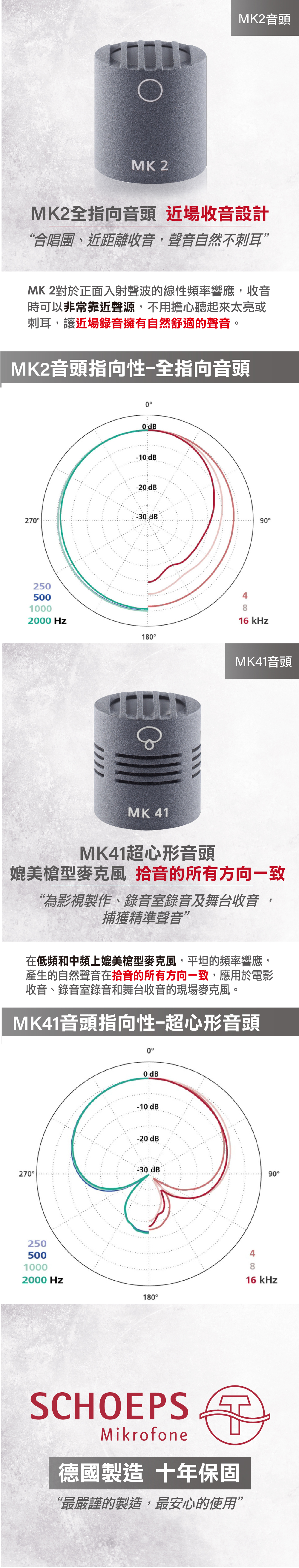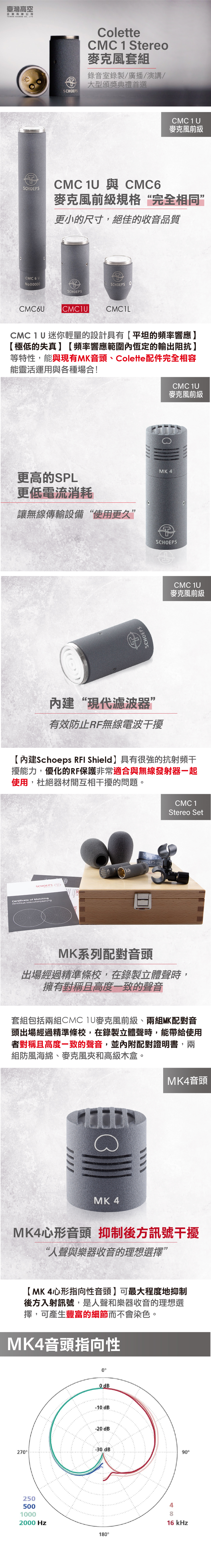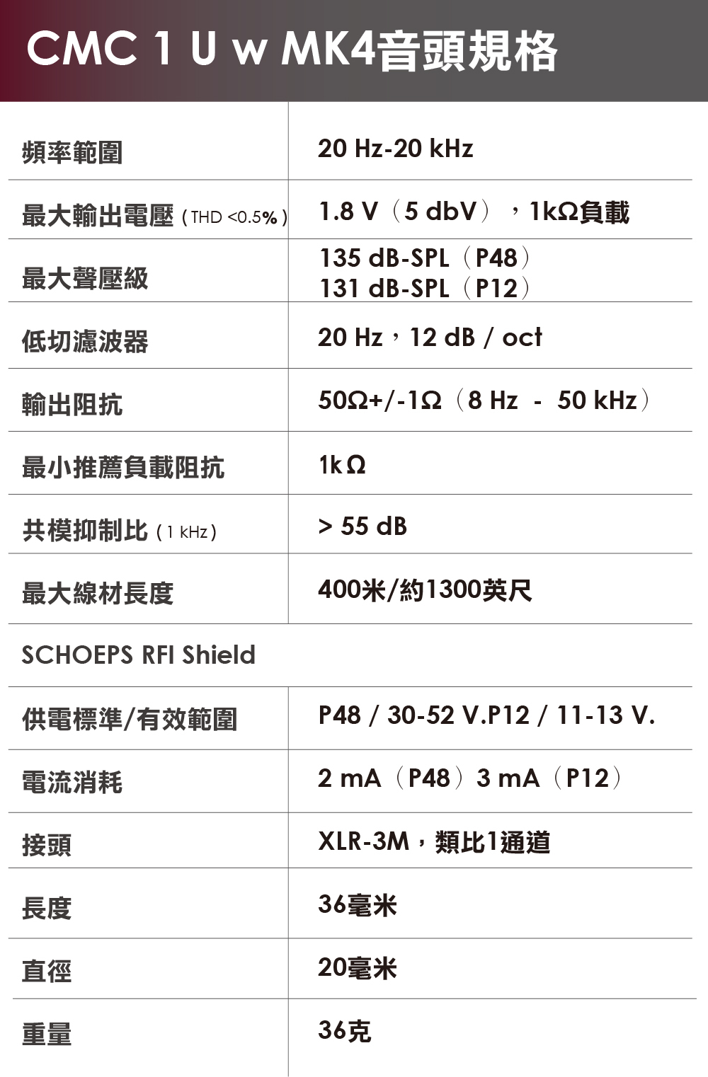 它具有平衡的XLR輸出,符合12V或48V幻象電源以及低電流消耗的特性。它的Schoeps RFI Shield對射頻干擾具有很高的抵抗力,可提供乾淨的低噪聲訊號。CMC 1支持各種MK音頭所能承受的最高SPL。