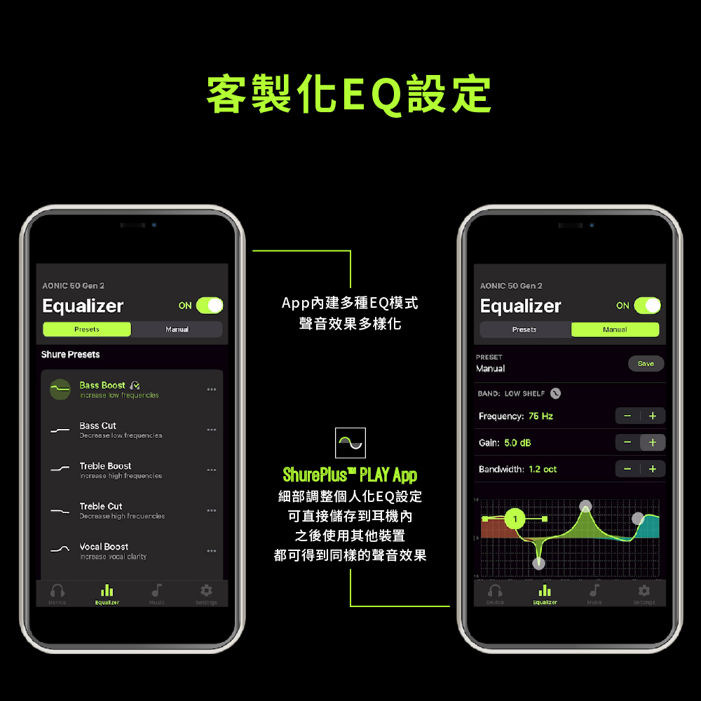 • 自定義EQ,多組預設模式,還能手動設定並保留在耳機中