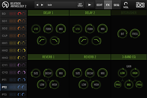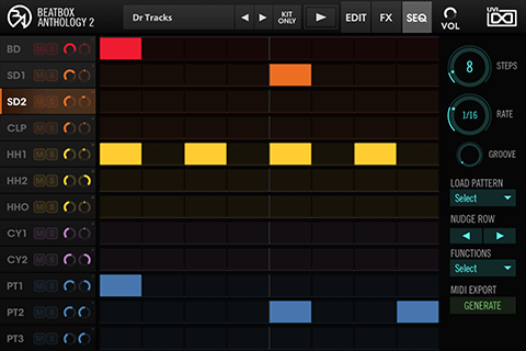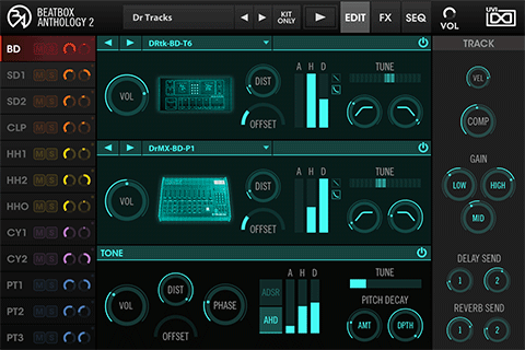 對於大多數用戶來說,原廠套件和模式已經足夠應付,但對於那些想要更深入的用戶,BeatBox Anthology 2 提供了每個音軌上的非常強大和靈活的 3 振盪器結構。低音鼓和冷鼓音軌各自配備了 2 個獨立的樣本層,和一個獨特的音調生成器,允許您輕鬆控制基本音高,而其餘的 9 個音軌則提供了 3 個獨立的樣本層,每個層都有獨立的音量、音高、失真、高通濾波器和低通濾波器、樣本起始時間(偏移)以及可切換衰減形狀的AHD包絡線,讓您可以塑造、層疊或混合任何鼓樣本,建立全新的混合聲音。