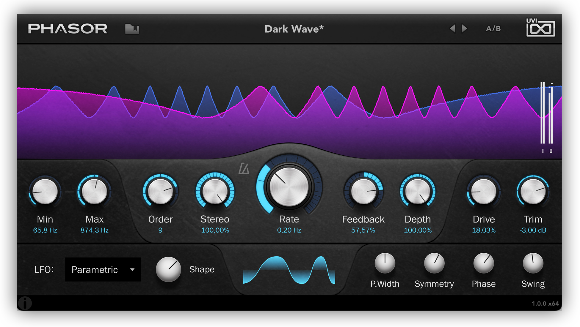 Phasor的全參數 LFO是一大亮點,借助可變波形、脈衝寬度、對稱性、相位和擺動,可以實現範圍廣泛的相位行為。點擊 LFO 波形顯示以操作常用起點,然後調整與節奏相關的調製以完美匹配您的音軌。