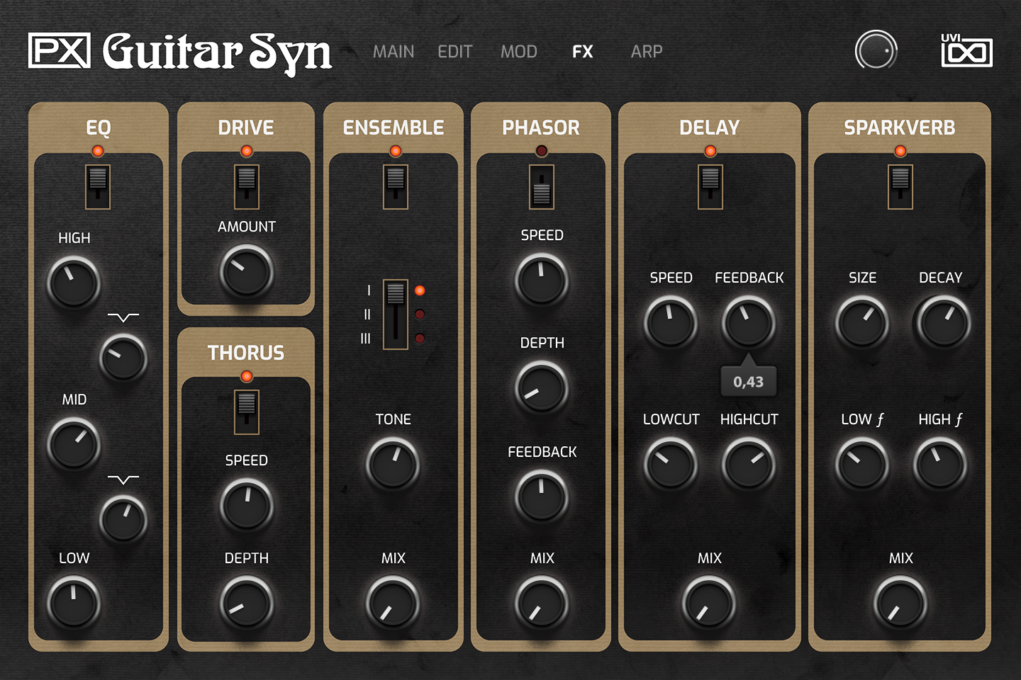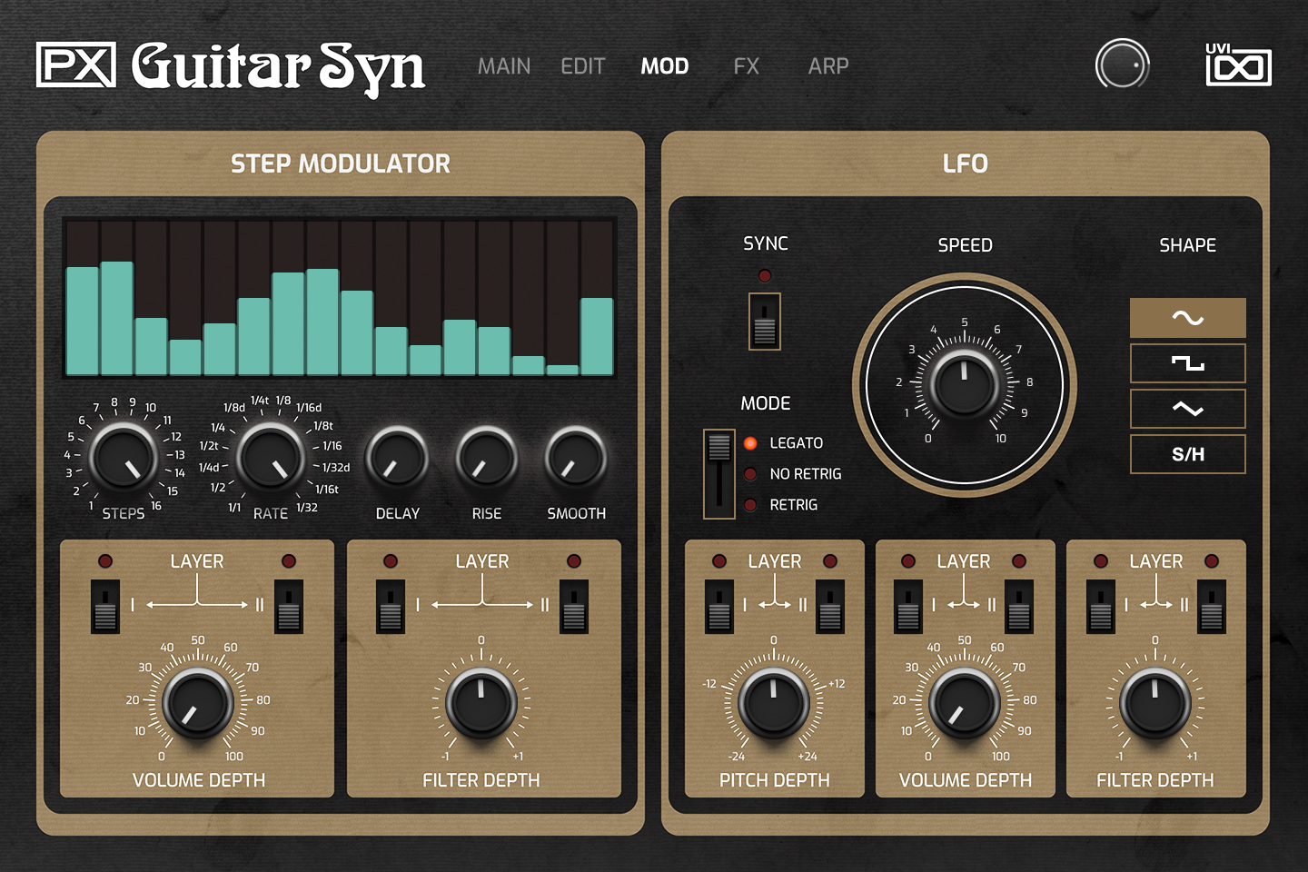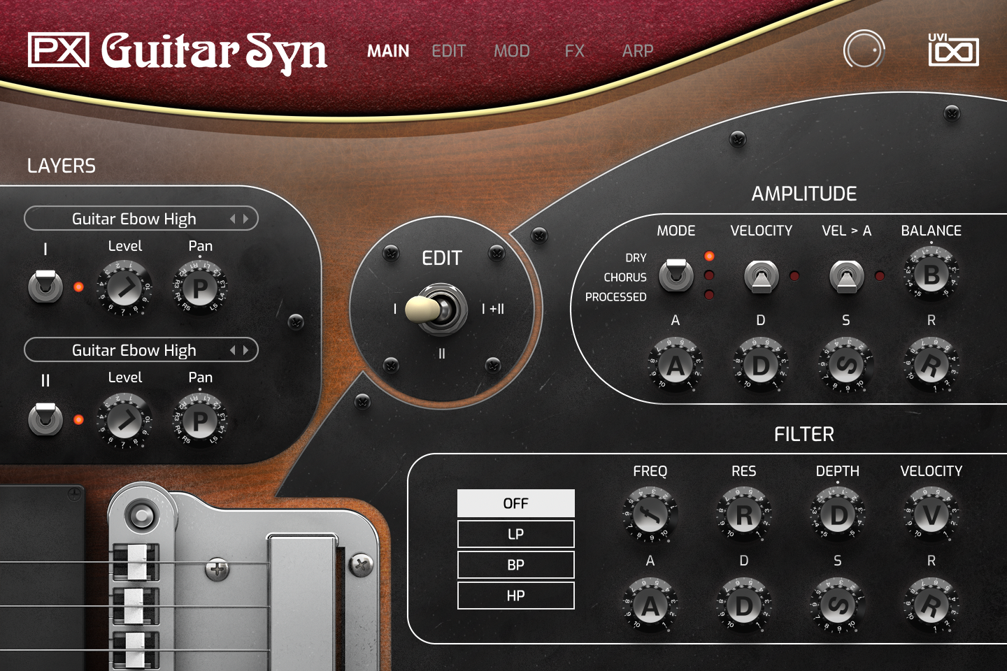Bass、Bells、Brass、FX、Keys、Leads、Organs、Pad、Pluck、Polysynth、Strings、Sweeps 等等,最終您可以獲得 300 個預設,所有這些都是由 UVI 的聲音設計團隊精心手工製作的。PX Guitar Syn 由 30,409 個硬體樣本組成的庫組裝成 217 層,帶有各種有用的音色,聽起來直接而生動。雙層架構意味著您可以輕鬆創造,並打開通往無數可能性的大門。