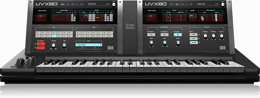 UVX80 基於日本知名製造商的第一款類比複音合成器,一款數控 2+1 振盪器、8 音色、61 鍵樂器,於 1984 年推出,具有華麗和未來主義的視覺姿態。 在技術上與 JX-3P 相當,這款合成器擁有更強大的架構,帶有 2 個額外的聲音、一個子振盪器和真正的脈寬調製。