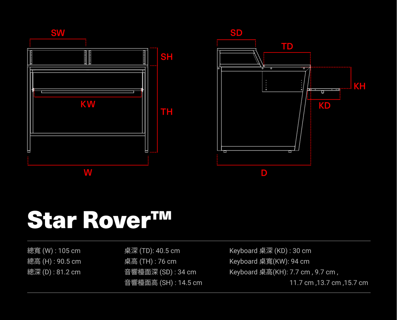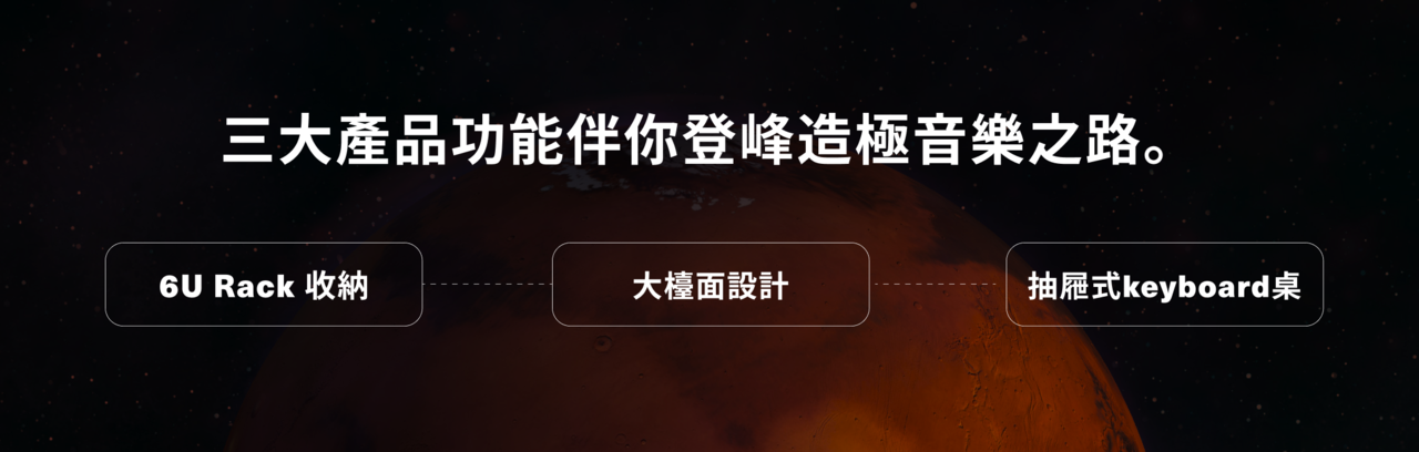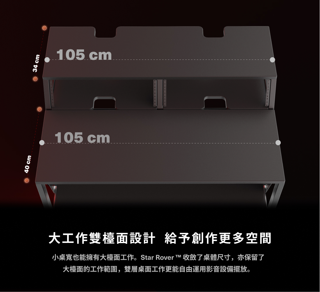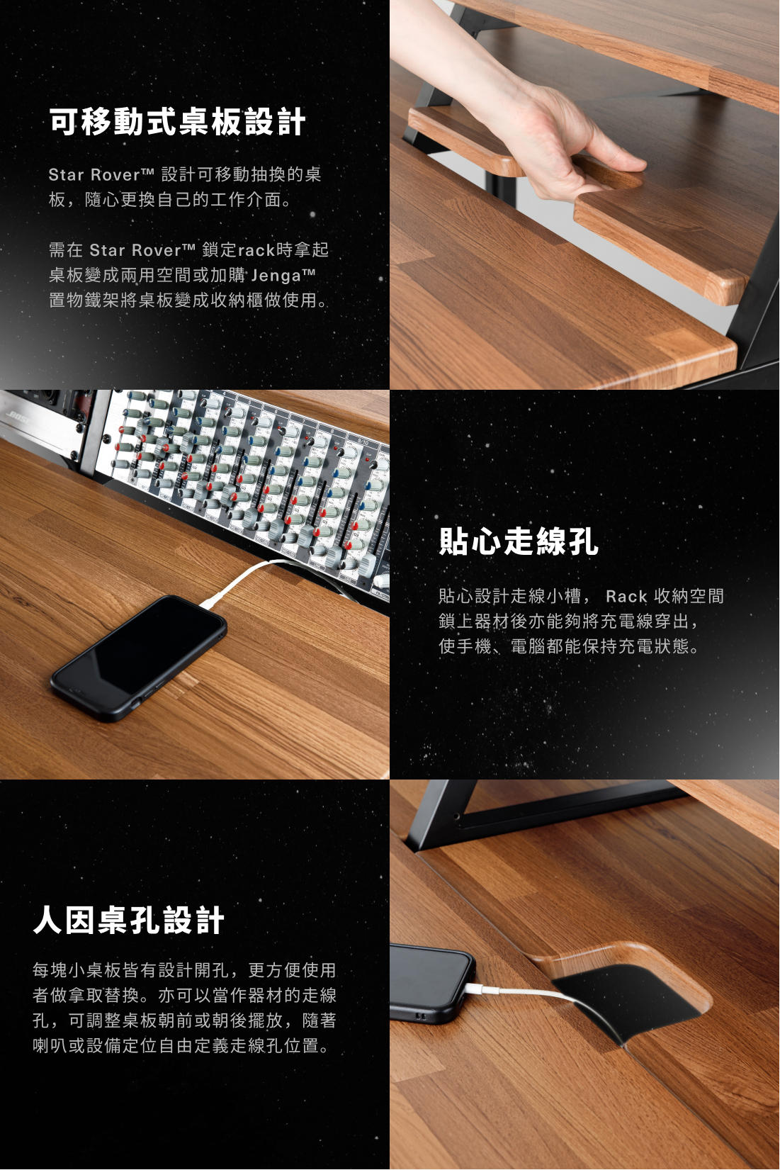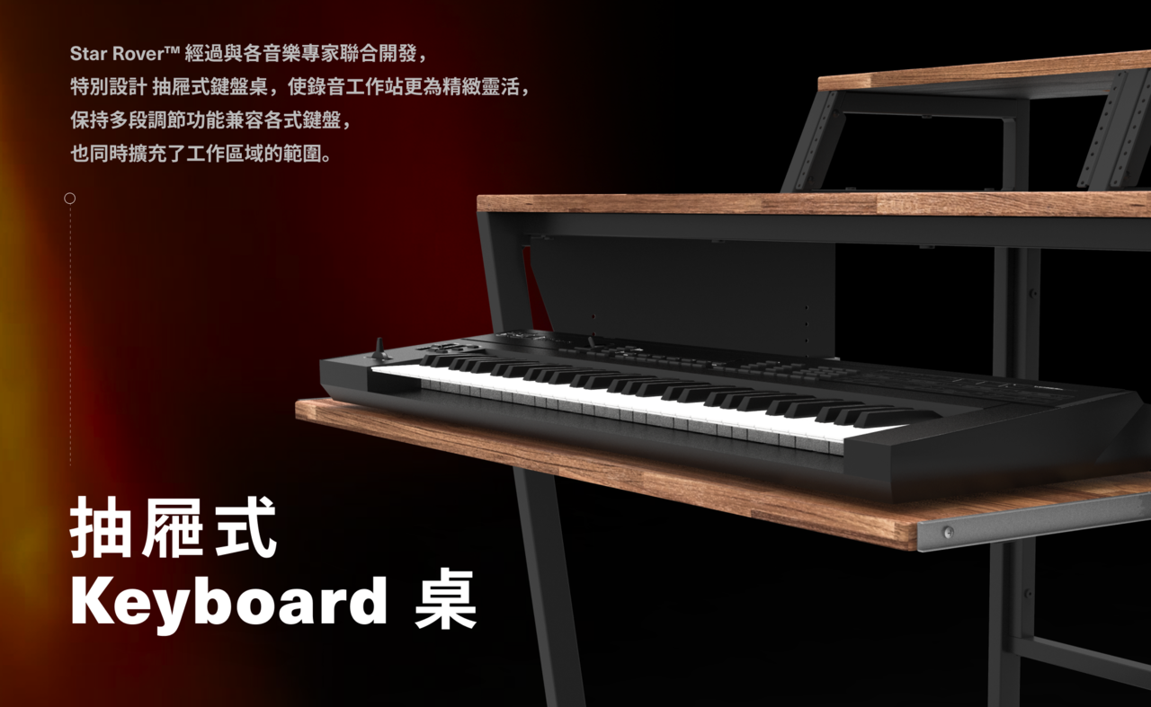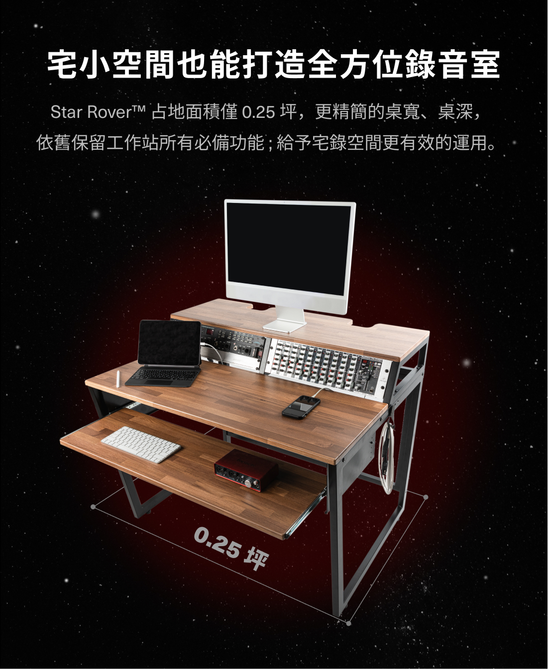 Star Rover™音樂工作站從人體工學、環境聲學、錄音工程切入,經過多位業界前輩指點設計而成的專業錄音桌。桌板環保級別為 CARB-P2。