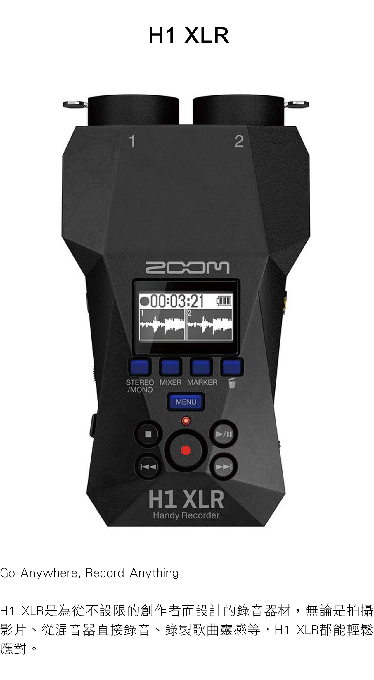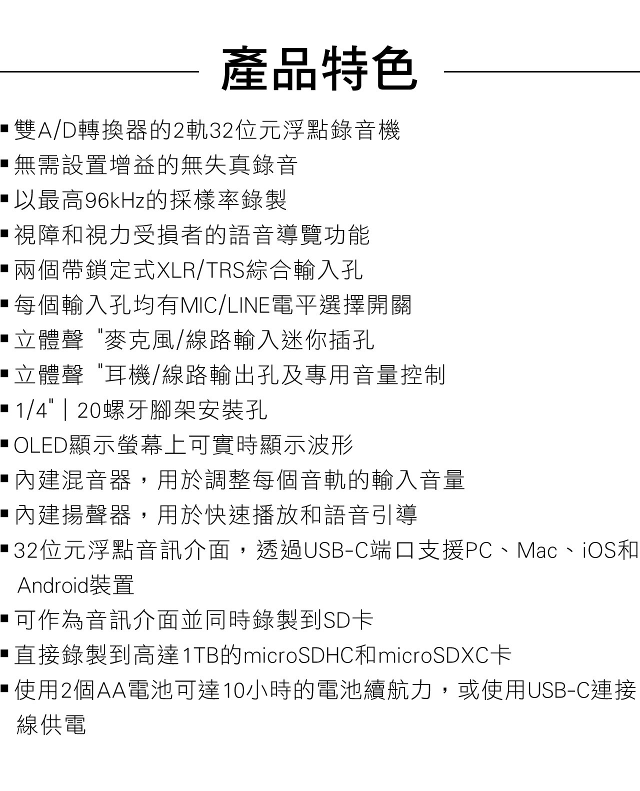 ● 雙A/D轉換器的2軌32位元浮點錄音機