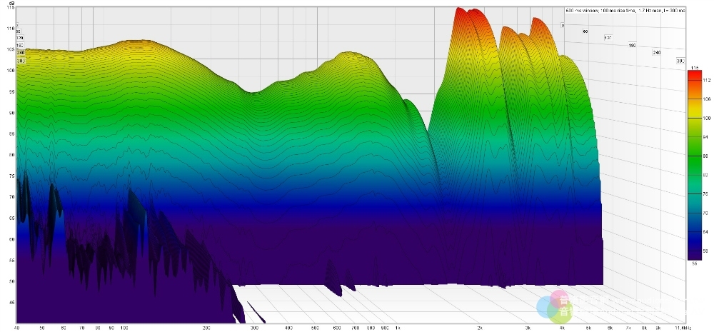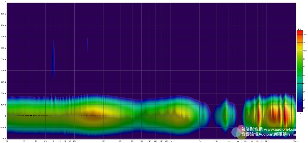 從這個圖可以看到,Austrian Audio Hi-X55大多數頻域皆沒有多餘的諧振,而且即便是300Hz以下的頻段,其諧振的能量感也非常小,整體來說這副耳機的聲音非常乾淨、清晰。