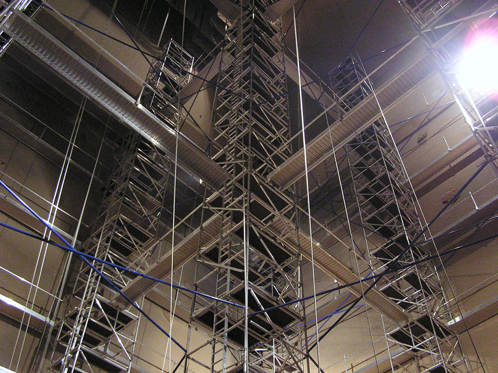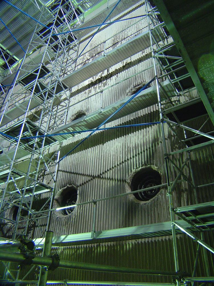 安全可及性–適用於鍋爐內任何地方的所有維護和檢查人員!輕便的Spandeck可以安裝在任何需要的高度上-低於過熱器區域,另外的垂直塔架可以進入過熱器壓板。護欄安裝在腳手架的所有外邊緣。