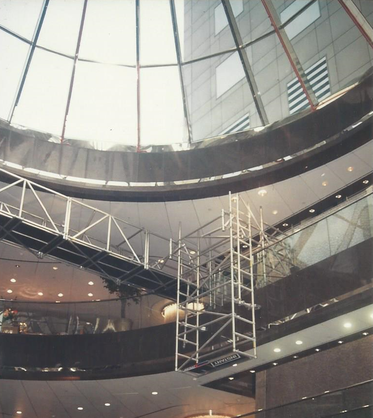 台北市遠企Mall中庭, 圓錐形屋頂清潔橋&單寬鋁合金工作架,懸空在20米的7樓, 快速組裝/拆卸,利用下班時間工作不影響賣場營業,收藏體積小,一個停車位大小,安全有保障,可使用20年。