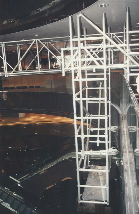 台北市遠企Mall中庭,走道外牆大理石掉落,須要緊急搶修,非鋁合金懸掛特殊工作架莫屬,工程人員是懸空在走道外牆,工程人員必須經過鋁合金架到達工作位置才方便施工。鋁合金架順著走道外牆推行一圈即可完工,快速完成緊急搶修。