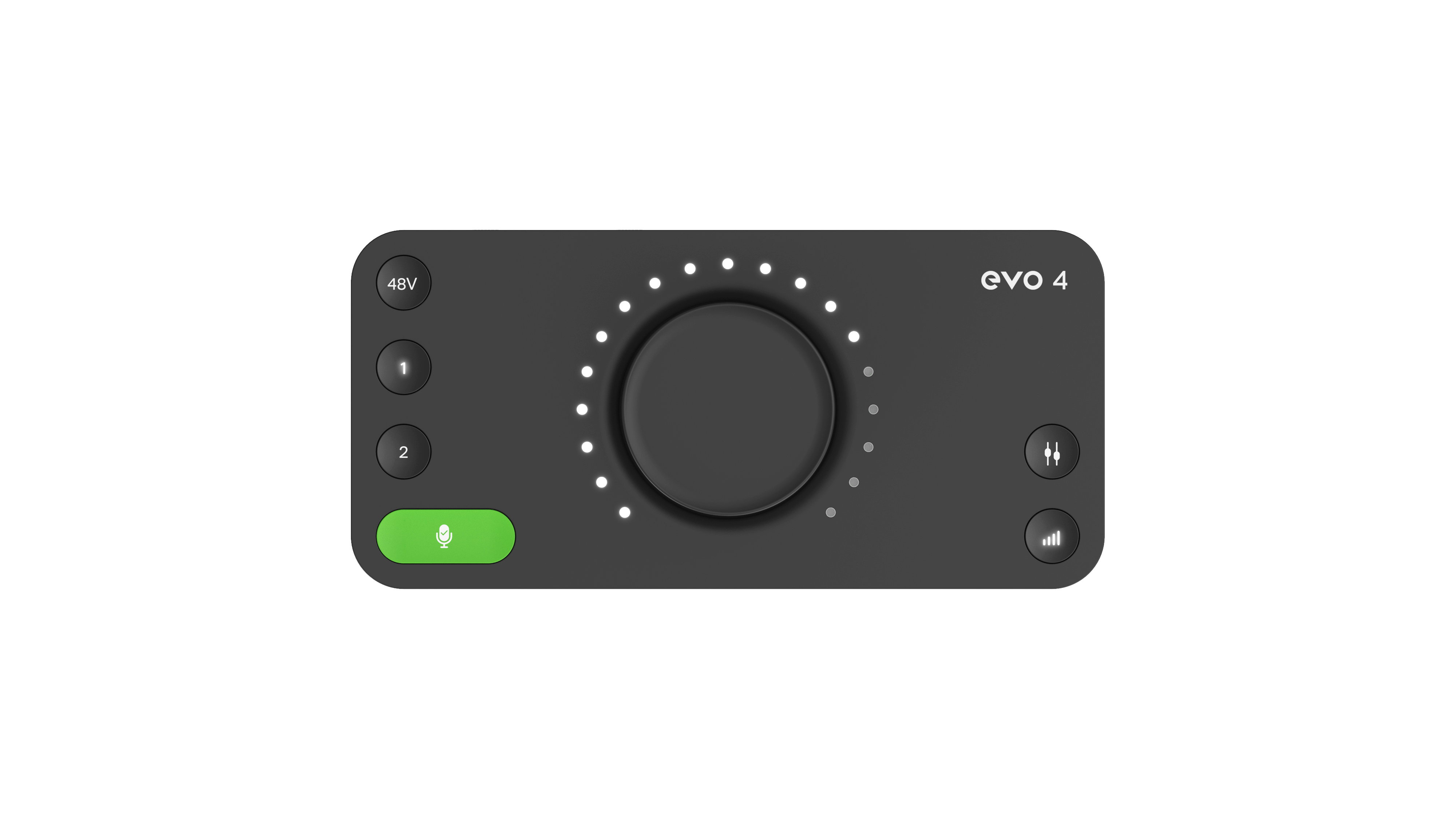 EVO 4的軟體不包括軟體混音器與控制面板,幾乎所有操作都是通過旋轉編碼器和按鈕直接在設備的頂部面板上完成的,視覺上的反饋主要來自於LED環。每個按鈕將旋轉編碼器切換到不同的模式。例如,如果要調整麥克風的增益,就按下標有 1和2的其中一個按鈕,它們會亮起以表明處於活動狀態,編碼器將控制增益,而LED環將顯示產生的輸入水平,而如果輸入過載,則LED環將閃爍紅色。