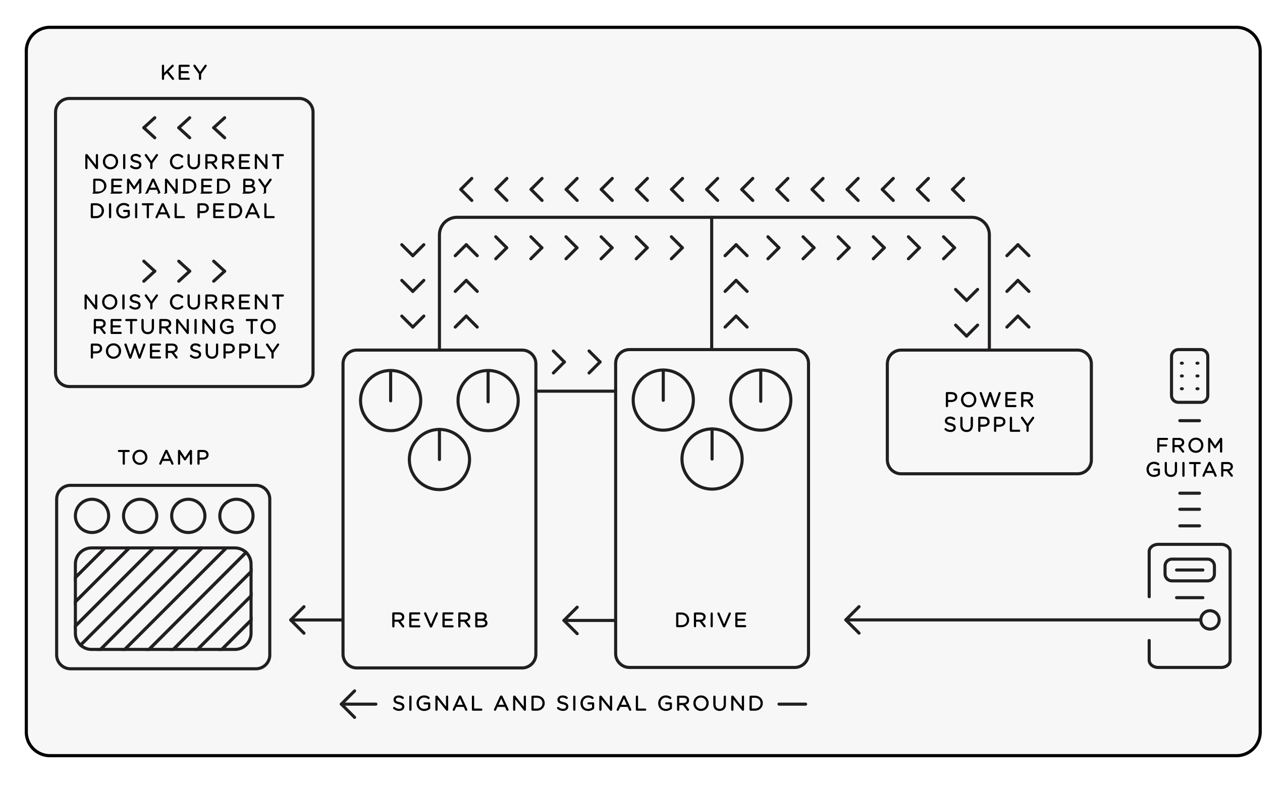 使用耗電的數位效果器時,接地環路也是一個大問題。由於處理器動態電流的需求,數位效果器往往要求電流經常因音頻頻率而變化。對於設計良好,正確接地的效果器,這個噪音電流可被電源線隔離,以遠離音頻電路和訊號接地。然而,一旦發生接地迴路時,會有多個接地路徑通往電供。在這種情況下,某些噪聲電流將從訊號路徑返回到電源,注入噪聲到音頻路徑,這被稱作共阻抗耦合 Common Impedance Coupling。