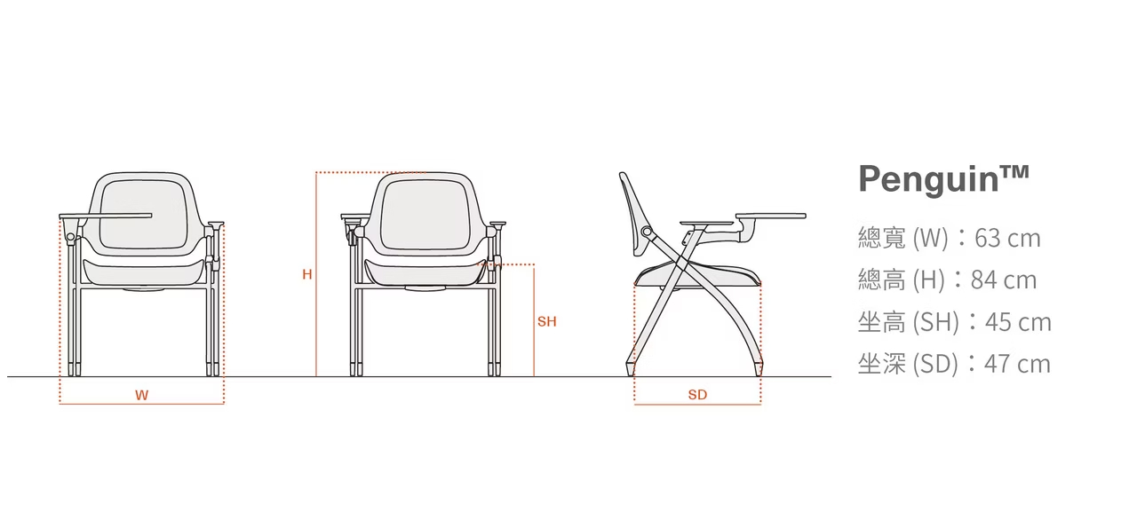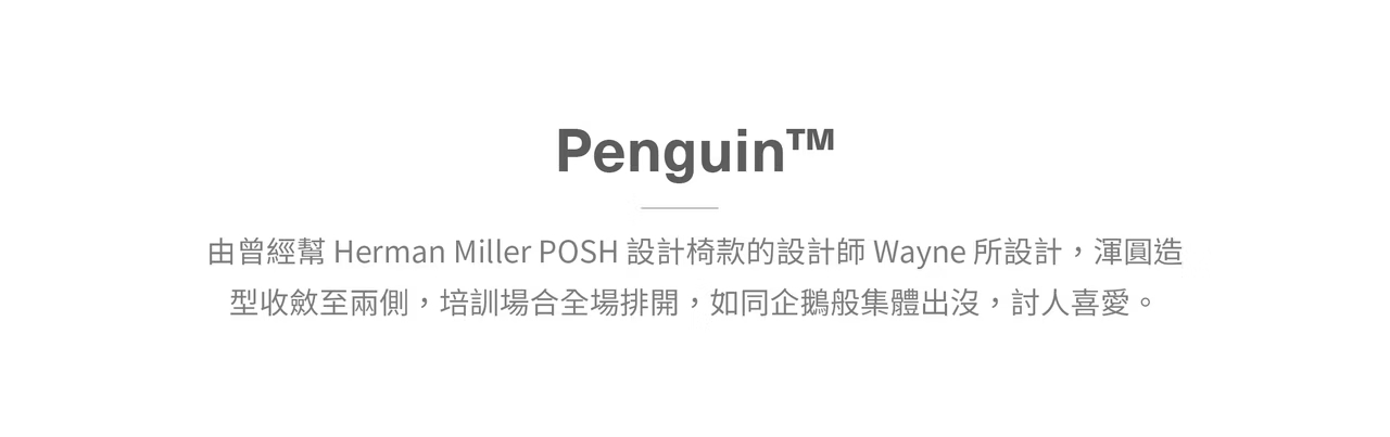 由曾經幫 Herman Miller POSH 設計椅款的設計師 Wayne 所設計, 渾圓造型收斂至兩側,培訓場合全場排開,如同企鵝般集體出沒,討人喜愛。